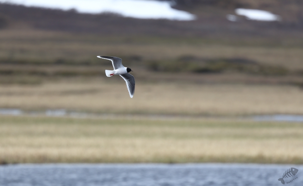 In 2025 had ik bedacht mijn, zo langzamerhand, jaarlijkse trip naar Varanger te beginnen met een bezoek aan het zuiden. Bij 1 van de baaien van de Pasvikelva stond een kijkhut met uitzicht op het water. De afstand was groot, maar tot m’n grote plezier bleek er inderdaad een Dwergmeeuw rond te vliegen bezig aan de jacht op kleine insecten op het wateroppervlak. De foto’s waren niet geweldig, maar ik had er een nieuwe soort bij. Tijdens mijn verdere verblijf op het Varanger schiereiland ben ik verschillende keren naar Komagvær geweest. Voorafgaand aan de eerste keer dit jaar, sprak ik een dame die wist te vertellen dat ze een Dwergmeeuw in V gezien had. Ik twijfelde een beetje of het zou kloppen, maar niet lang nadat ik Komagvær aangekomen was, zag ik inderdaad deze kleine telg uit de Meeuwen familie. Ik ben daarna nog verschillende keren naar Komagvær geweest en lukte het steeds betere foto’s te maken van deze ontzettend leuke soort.
