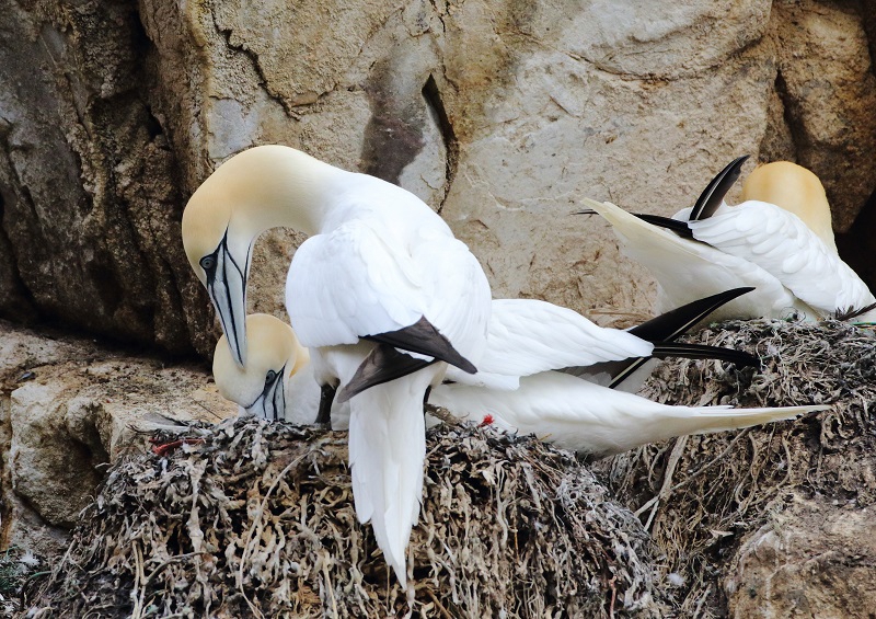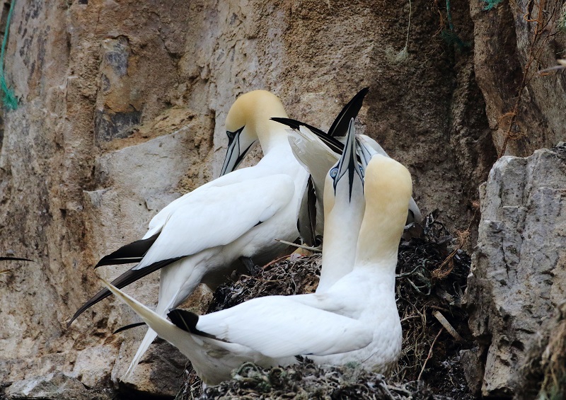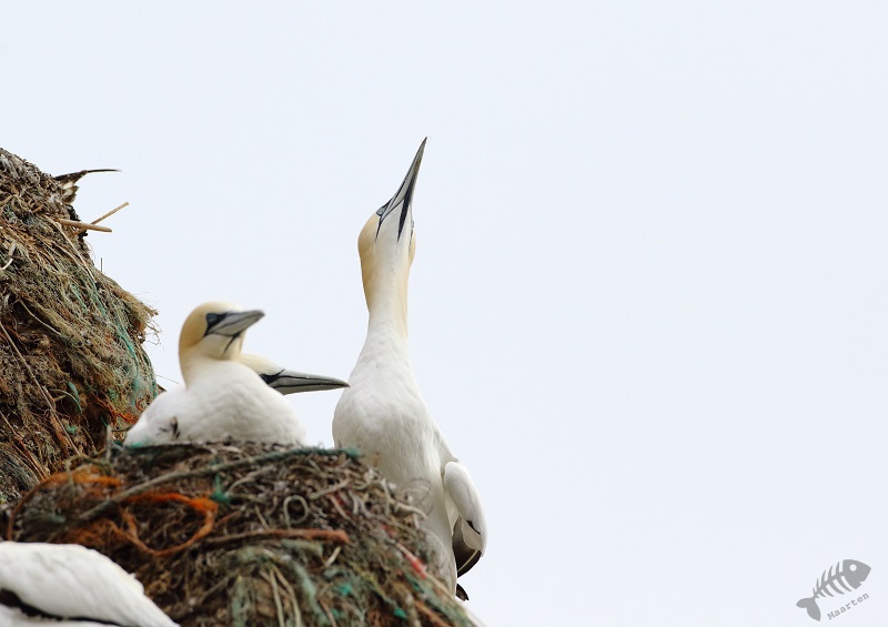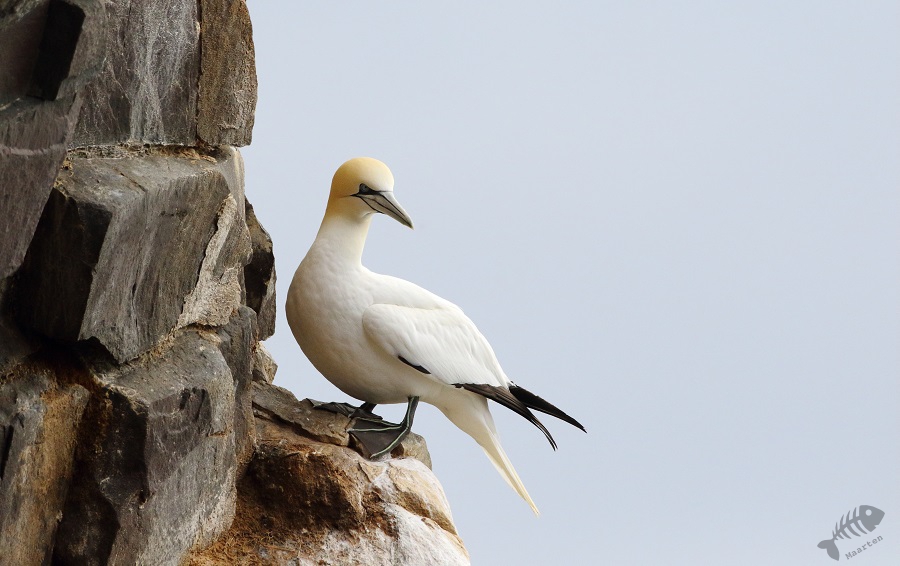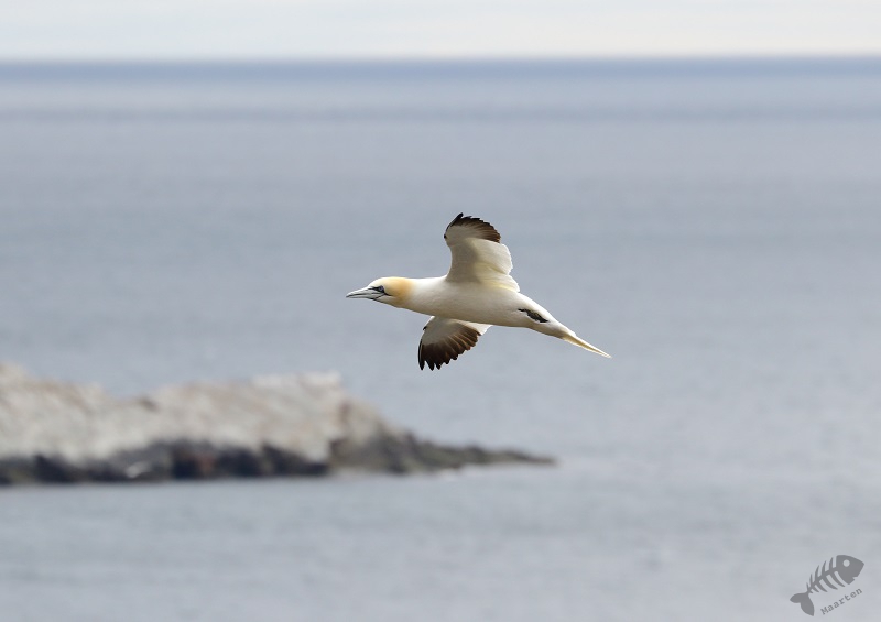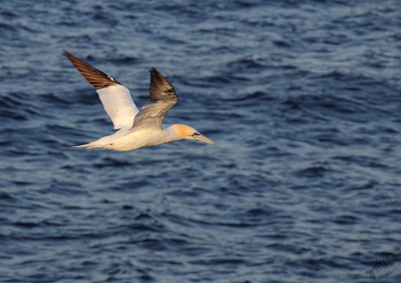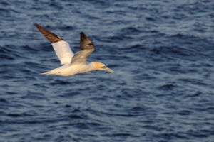 Er zijn van die tot de verbeelding sprekende vogels en de Jan-van-Gent is er voor mij zo ééntje. Op de plaatjes zien ze er mooi uit en de filmpjes die ik zag over hun jachttechniek zien er spectaculair uit. Maar zeker ook de onbereikbaarheid van deze vogels: ze leven op zee en komen aan land op te broeden op hoge, steile kliffen en in Nederland is de kans ze te zien wel heel minimaal. Gelukkig ben ik in de gelegenheid geweest een land te bezoeken waar ze zeker nog te zien zijn: Schotland. Tijdens een excursie naar een zeevogel-eiland kwamen er inderdaad verschillende voorbij vliegen, maar vastleggen lukte maar amper. In Noord-Ierland kon ik ze zien vanaf een hoge klif en zag ze inderdaad op hun indrukwekkende manier jagen, maar vastleggen lukte maar amper. Zo sloop de vakantie voorbij en leek het erop dat ik één van mijn wenssoorten niet zou kunnen vastleggen. Met een lichte teleurstelling (niet in de laatste plaats omdat de vakantie er weer opzat) gingen we weer aan boord van de ferry om terug naar Nederland te gaan. Om de vakantie zo lang mogelijk te rekken, en om de gelegenheid te hebben nog iets te zien, heb ik zolang het nog licht was, op het observatiedek gestaan. Samen met een crew lid dat als vogel- en whalespotter aangenomen was. We waren de enige 2 op het dek en dat maakte het extra aangenaam. Al vrij snel vlogen de eerste vogels voorbij de boot: Papegaaiduikers, Zeekoeten en…: Jan-van-Genten! 2 Exemplaren vlogen dicht langs ons dek, zodat ik ze prachtig kon vastleggen. Verderop zagen we er een aantal jagen en bij het laatste licht bleven ze in de buurt van de boot. Daarmee werd een toch al heerlijke vakantie, nog net een beetje beter! Oja: wat verder op de Noordzee zagen we ook nog een Walvis onderduiken. Ik meen een Minkywhale, maar dat weet ik niet meer helemaal zeker. Maar gaaf was het!