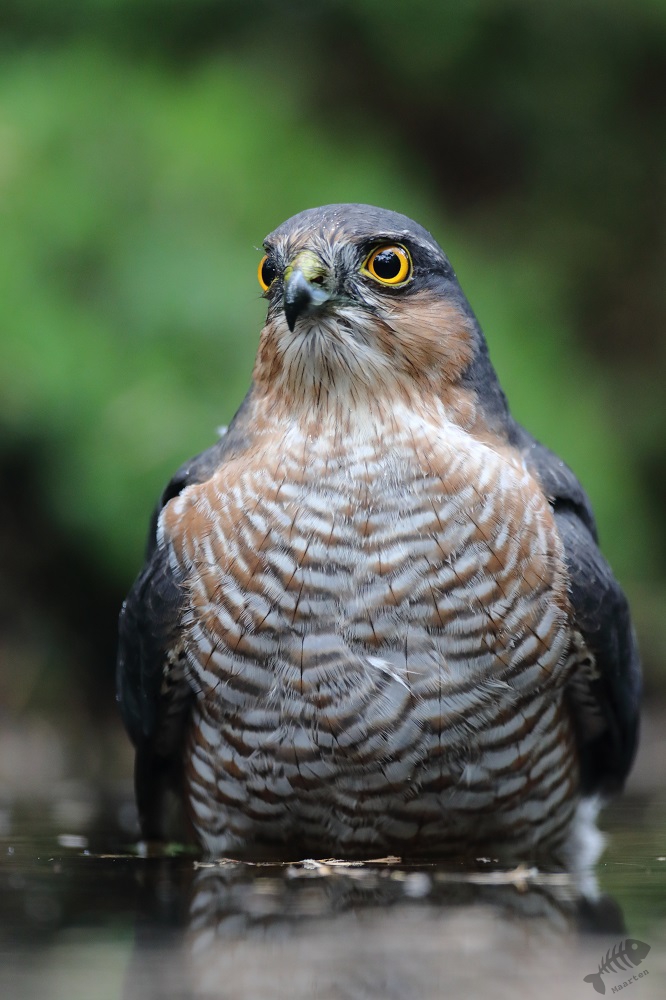 En op een dag in februari, terwijl ik natuurlijk niet thuis was, verscheen er een Sperwer in onze tuin en sloeg daar een Tortel. Ik werd snel gebeld en haastte me naar huis, waar ik nog zeker 2 uur de gelegenheid heb gekregen haar te fotograferen. Verderop in dat jaar kreeg ik ook de kans om een prachtig exemplaar vanuit een hut vast te leggen en toen leek toch wel of de liefde wederzijds was. Misschien is hij dat wel, omdat ik elke winter voor een uitgebreide lunchtafel zorg. Ze hoeven alleen maar binnen te vallen en aan te schuiven…