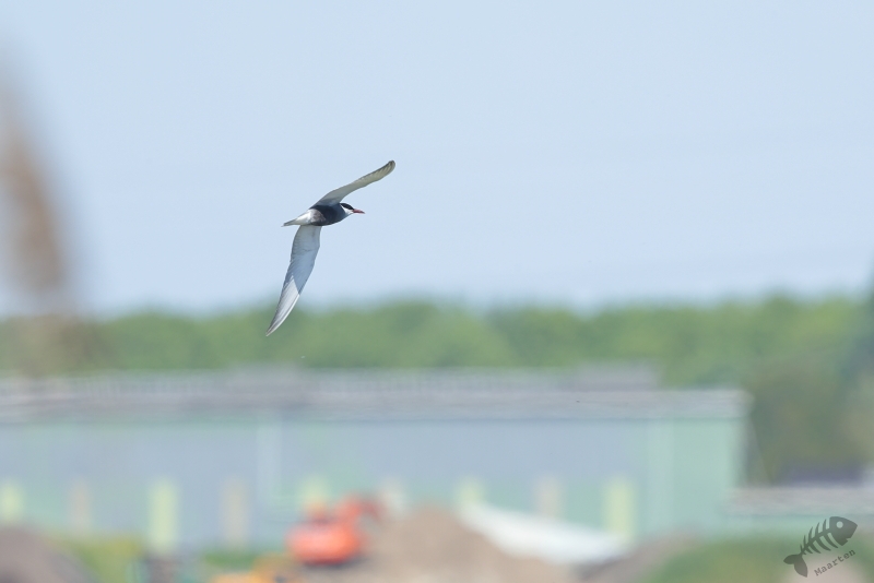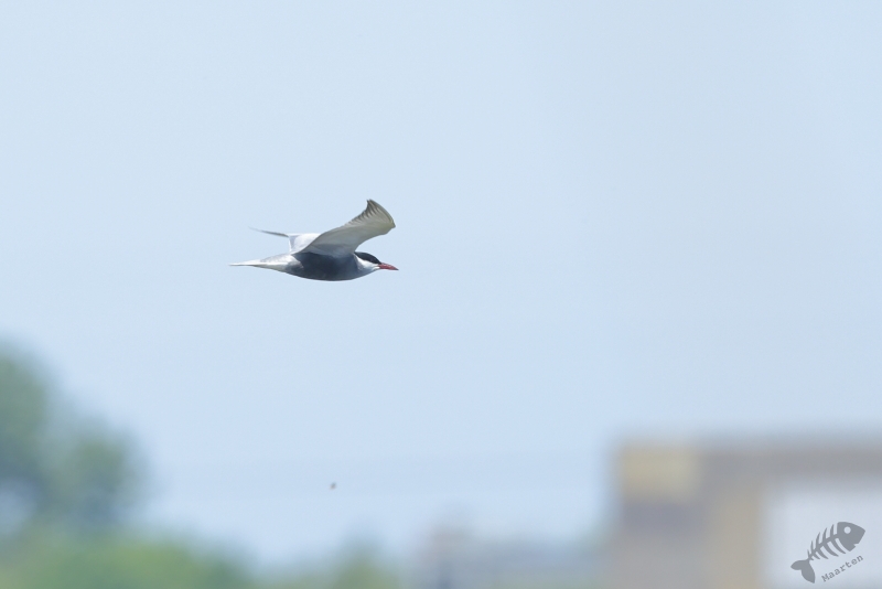 Daar aangekomen hoorde ik van weer andere vogelaars dat ze er inderdaad zaten en ze hadden het nog niet gezegd of ze zagen er al 2. De rondzwoegende vogels maakten een ander geluid dan veel andere Sterns, een beetje schorrer, eigenlijk wel leuk om te horen (wat dan bij Sterntjes niet altijd het geval is…). En nu ik wist waar ik op moest letten, heb ik er verschillende gezien en kunnen fotograferen. En zo had ik er weer een familielid bij uit deze fascinerende familie. En ook deze is prachtig. Weer een zwoegende vleugelslag, subtiel witte wang en een wat zwaardere rode snavel.