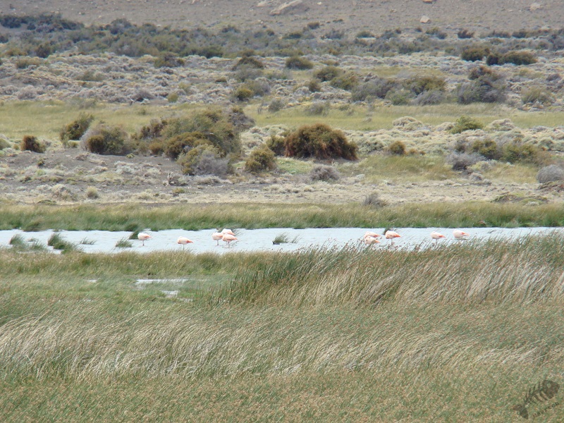 Na deze bijzondere waarneming hebben we de terugreis weer aangevangen. We wisten nu wat ons te wachten stond en hebben het rustigaan gedaan. Het bleek druk op de weg te zijn geworden, want we kwamen nog een andere auto tegen. In een meertje waar we langskwamen stond een groep Flamingo’s. Ook dat was wel een bijzonder gezicht. Toen we in El Chaltén aangekomen waren, we gingen niet meteen naar El Calafate omdat we eigenlijk 2 nachten in Estancia Maipú zouden blijven, bleek dat we onderweg allebei hadden zitten denken: “Nog 40km naar het kruispunt, dat kun je lopen als de auto er mee ophoudt, nog 30km dat kunnen we zeker lopen, etc”. Het was toch wel een spannende rit gebleken…
