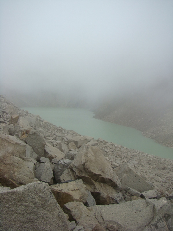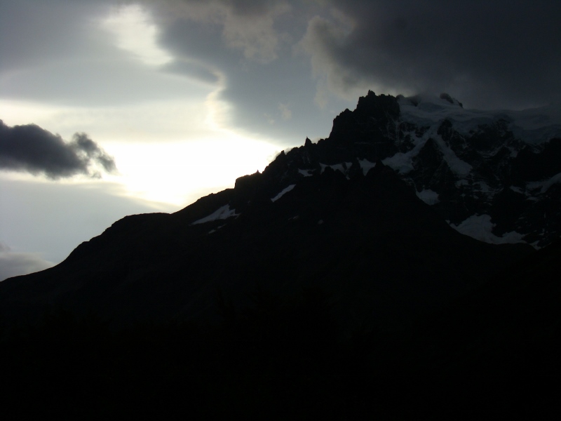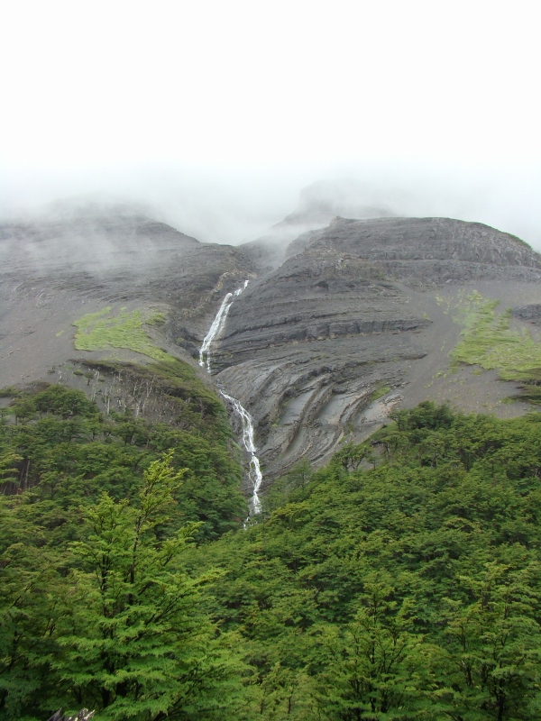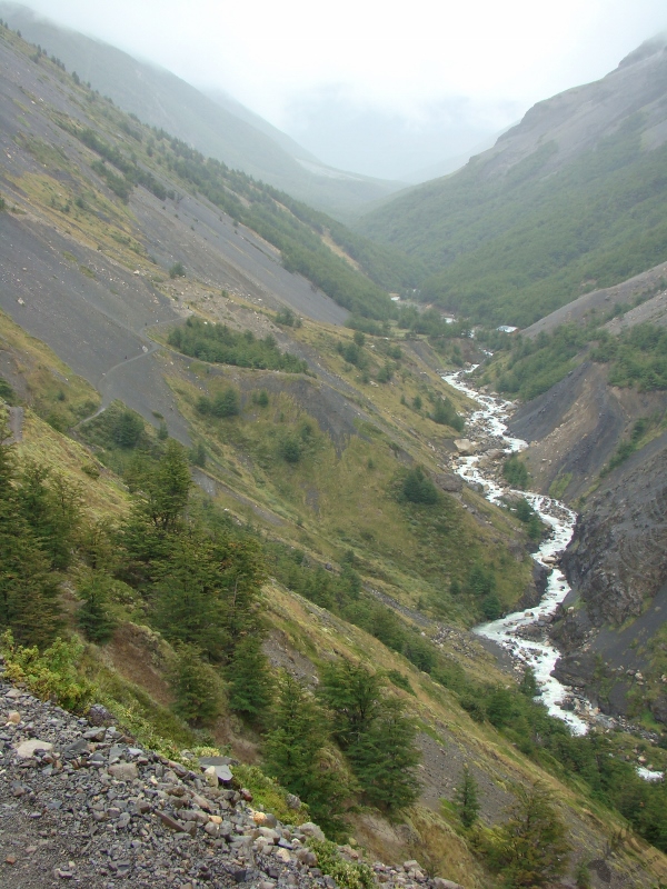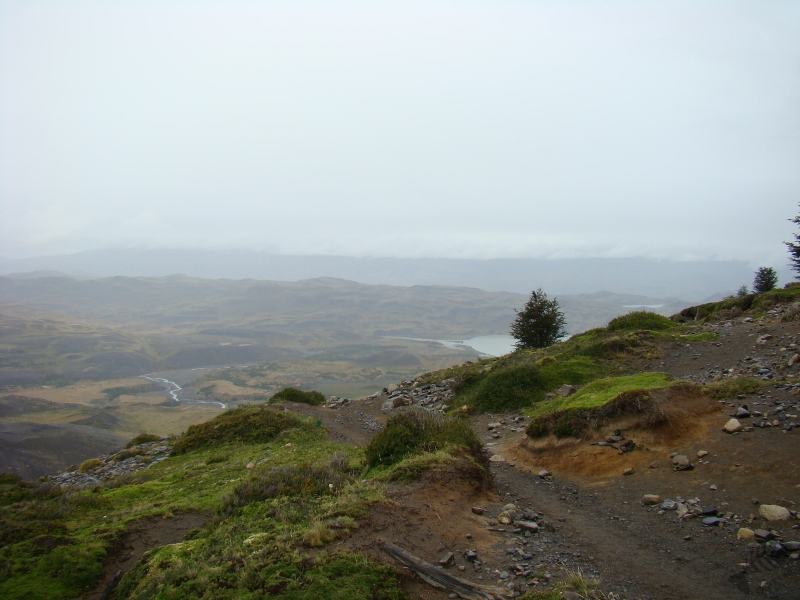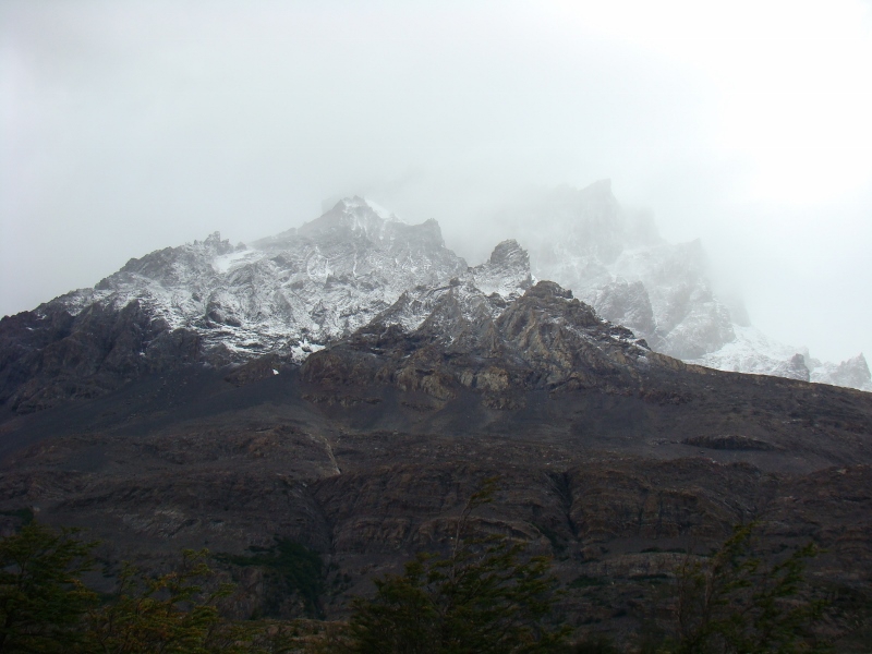 Het bleek redelijk pittig… Vanuit de bus liep onze route als eerste naar Refugio Chileno. Een wandeling die voornamelijk uit klimmen bestond en ons sterk deed twijfelen of wandelen in de Torres eigenlijk wel leuk is. Nat, moe maar niet minder voldaan bereikten we de refugio en merkten dat we nog wel een beetje energie over hadden. Die energie hebben we aangewend om nog een stuk verder te wandelen. Het gebied de Torres del Paine dankt zijn naam aan 3 bergen naast elkaar gelegen in het centrum van het gebied. Deze 3 “Torens” zijn alleen vanaf een aantal punten te zien en vanuit Refugio Chileno was zo’n punt te bereiken. We zijn naar dit uitzichtpunten gelopen, een bergmeer aan de voet van de Torens en ontwaarde…: de Torres in dikke mist gehuld… Het mocht dus deze dag niet zo zijn en we zijn terug naar de refugio gelopen.