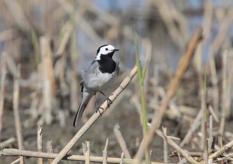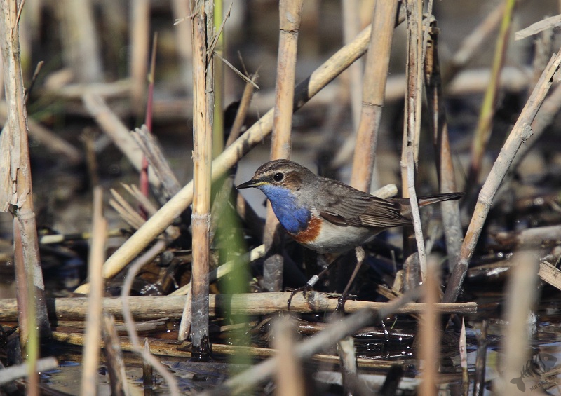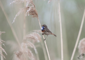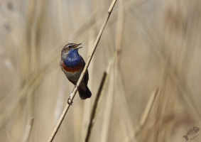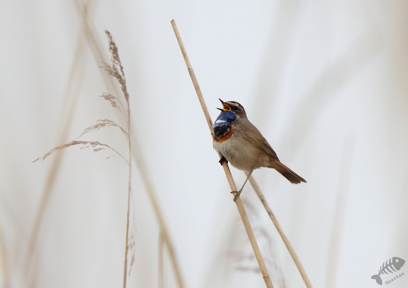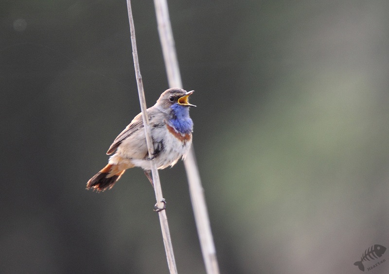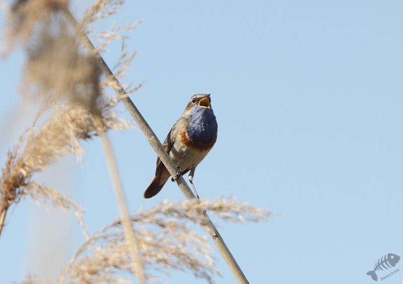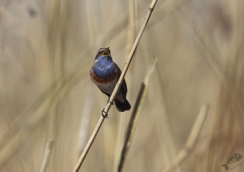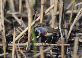Keersluisplas gegaan en ben daar een paar uur gaan zitten. Er kwam een sympathieke fotograaf bij me zitten en samen hebben we zitten afwachten of het zou gaan lukken. Al vrij snel liet de, niet wit-gesterde, Blauwborst zich zien. Eerst weer in de Wilgjes op afstand, maar na een uur of 2 gooide hij alle schroom opzij en kwam vlak voor me op de grond rondscharrelen! Het begin was er… Daarna vloog hij weer naar de Wilgjes, maar na een half uur ging hij redelijk voor me zitten zingen: het begon er op te lijken. Na nog eens een uur was hij daar eindelijk: hoog in de top van een rietstengel vlak voor de hut, ging hij zitten zingen! Mijn collega van de ochtend ging toen verder kijken. Even verderop, op de hoek van de Keersluisplas, zou een Blauwborst zitten die zich regelmatig volop liet zien. Ook vertelde hij dat er aan de Praamweg nu Roodborsttapuiten zaten, die ook goed te zien zijn. Ik besloot nog even te blijven zitten om te kijken of deze Blauwborst nog even terug zou komen. Hij kwam niet meer zo dichtbij, dus ben ik ook maar gegaan om te zien hoe het verderop was.
