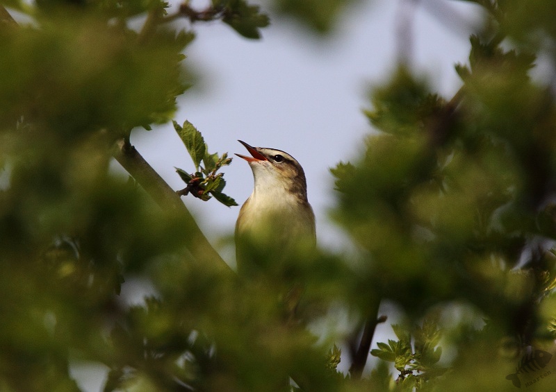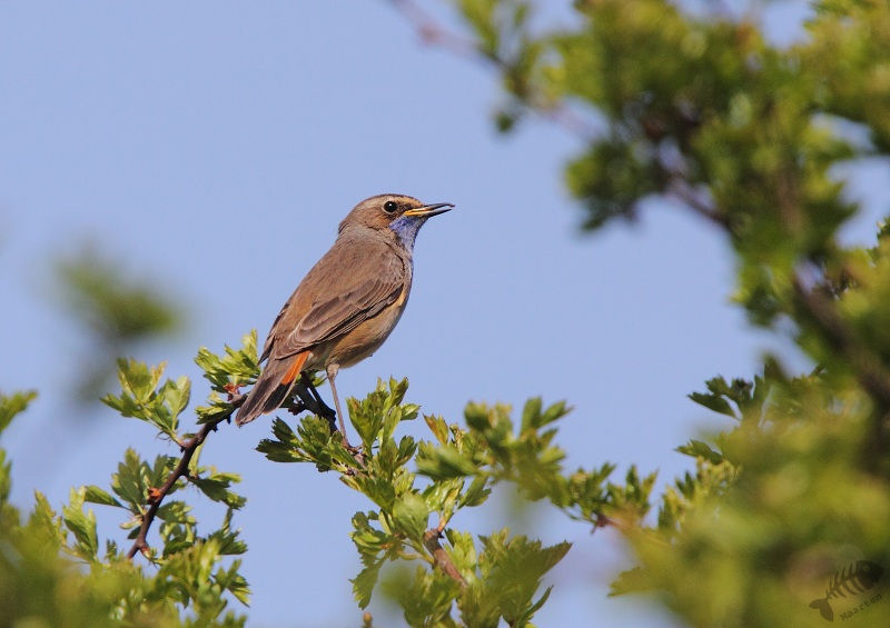 vastgelegd. Later vloog er een Rietzanger in een Meidoorn waar ik een foto kon maken van alleen z’n koppie omlijst door blaadjes. Ook zat er een Rietgors redelijk in de buurt. Hij zat boven op een rietstengel en kwam ineens heel dichtbij zitten. Daarna vloog hij op de grond en vertoonde nogal vreemd gedrag: een beetje sidderend, met zijn veren opgezet kroop hij over de grond. Ik keek eens goed en zag ineens de oorzaak: er zat een vrouwtje in de buurt… Opeens hoorde ik een Blauwborst redelijk dichtbij. Snel keerde ik die kant op en zat er inderdaad eentje vlak voor me, maar behoorlijk verscholen. Iets later vloog ook hij in de Meidoorn tegenover me, maar daar bleef het bij.