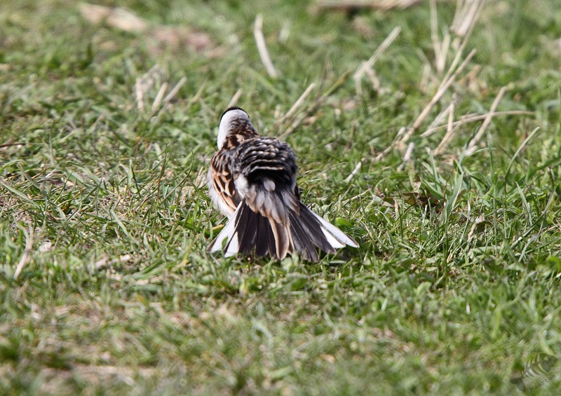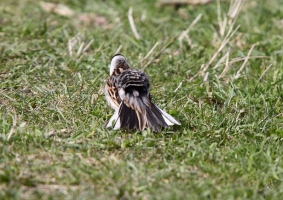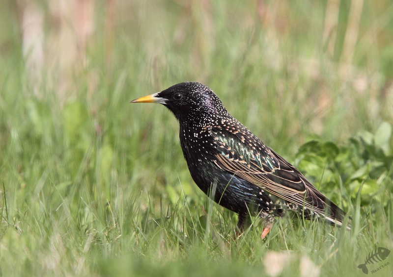 Ik ben weer teruggegaan naar de schuilhut. De Blauwborst liet zich niet meer zien, wel een Winterkoninkje. Ook een familie Grauwe Ganzen liet zich even zien en kwam de Kwikstaart weer even langs. Daar bleef het bij. Ik ben weer naar de auto gelopen en naar huis gereden. Net voordat ik de grote weg op zou draaien zag ik nog 2 prachtig glanzende Spreeuwen in het gras zitten. Het lukte me om ze mooi op de foto te zetten en daarna heb ik de thuisreis voortgezet. Blij met steeds mooiere foto’s, maar…