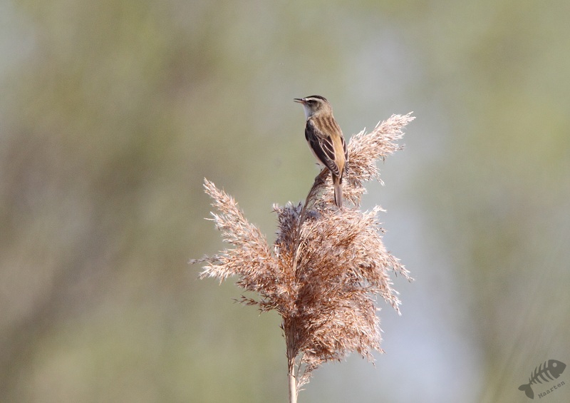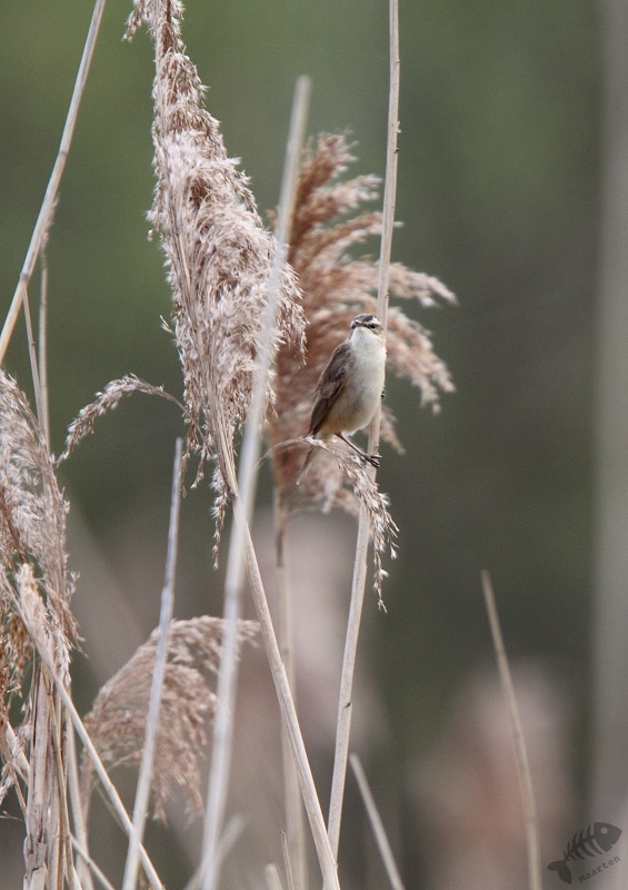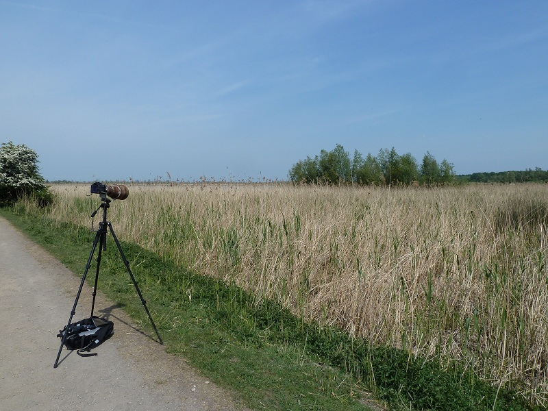 Snel ben ik ook naar de plek gelopen. Eerst hoorde ik een Rietzanger en kon deze ook mooi zien: ze beginnen lager in het riet te zingen en naarmate ze verder gaan, kruipen ze steeds hoger om uiteindelijk in de top volop te gaan zitten zingen. Zo had ik deze soort eindelijk ook een keer mooi