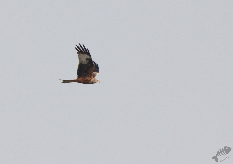 Ook de Rietzanger kwam weer even boven kruipen, maar minder uitbundig dan de dag hiervoor. In plaats van de Rietgors kwam er even een Pimpelmeesje in het riet gevlogen. Net als Winterkoninkjes zie deze echt overal. Terwijl ik daar zo stond, kwam er een grote roofvogel op afstand voorbij vliegen. Ik maakte nonchalant 2 foto’s en dacht: zo, in ieder geval ook een Bruine Kiekendief erbij… Toen ik ’s avonds thuis was en de foto’s aan het bekijken was, bleek dat het niet ging om een Bruine Kiek, maar om een Rode Wouw! Dat was wel even een verrassing en een les in nederigheid… Na enige tijd kwam de niet-gesterde Blauwborst even ergens anders zitten: op de plaats waar 5 dagen terug zijn concurrent nog zat, ging hij nu volop aan het zingen in de Meidoorn.