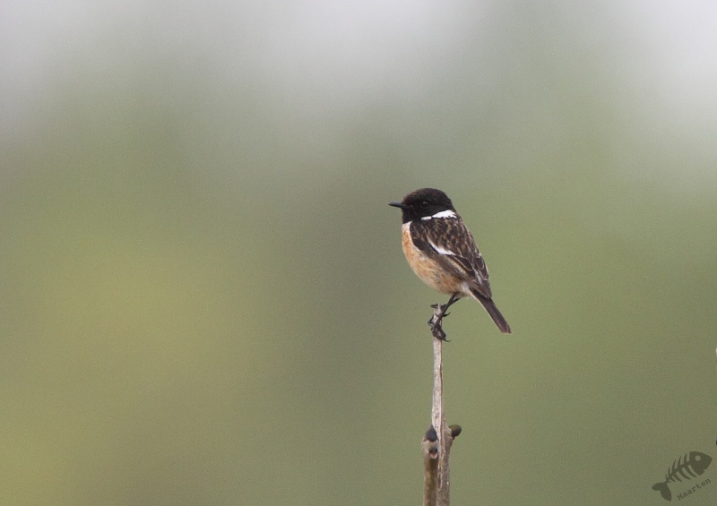 Met de gedachte misschien de IJsvogel weer eens te zien, ben ik naar de Poelruiter gereden. Je gaat dan over de Praamweg, waar een paar dagen geleden mijn collega-fotograaf over wist te vertellen dat de Roodborsttapuit er zit. En inderdaad: er zat er 1. Met een beetje manoeuvreren kreeg ik hem voor een mooie achtergrond en aardig in beeld. Bij de Poelruiter heb ik de IJsvogel niet gezien. Er kwam een Fuut onderlangs voorbij zwemmen en verder bleef het daar rustig.