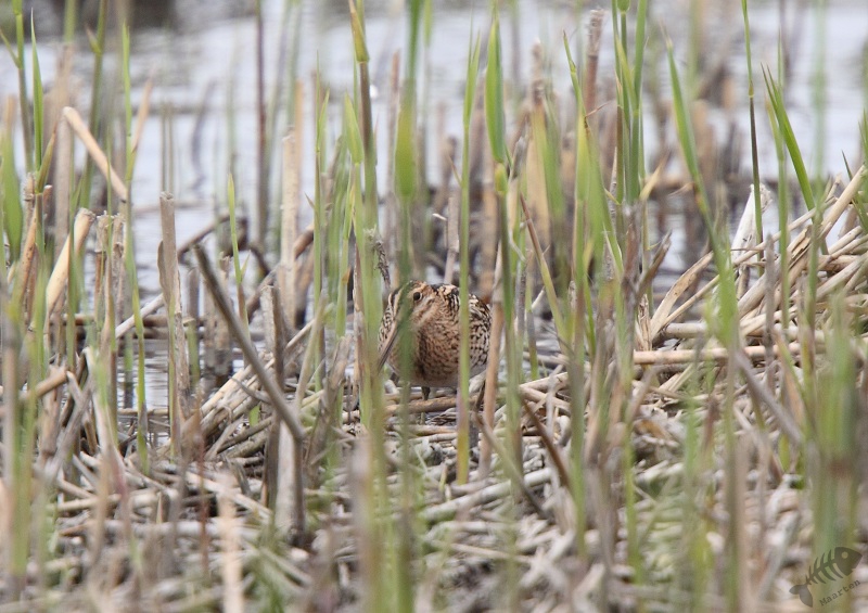 Ik ben weer teruggelopen en zag in de plasjes langs het bos nog een Kuifeend. Verder was het rustig. Ik ben doorgegaan naar de schuilhut aan de Keersluisplas. Er stonden verschillende mensen en 1 wist te vertellen dat er weer Watersnippen zaten. Het riet was aan het groeien en ze zaten achterin, maar ondanks hun geweldige schutkleurén waren ze af en toe toch te zien.