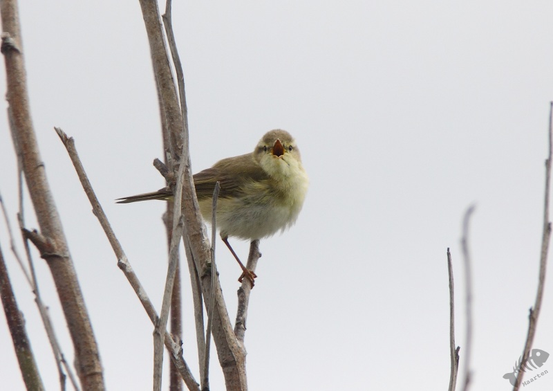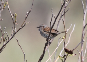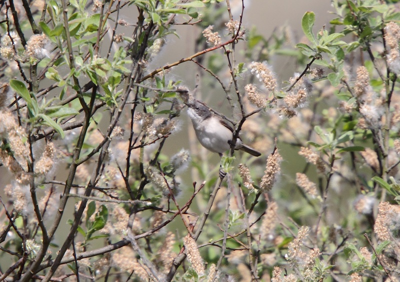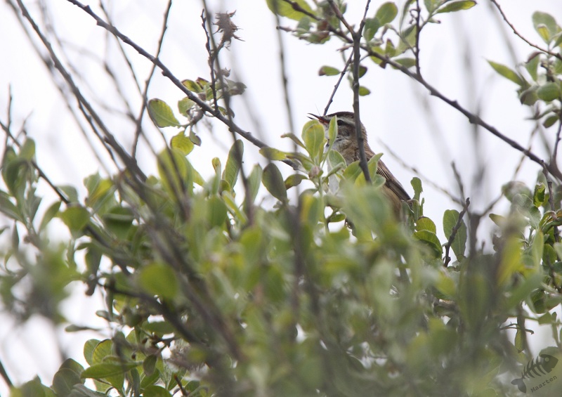 Na een klein half uur, komt de Bruine Kiekendief inderdaad behoorlijk dicht voor me langs en heb ik mooie foto’s kunnen maken. Het plannetje leek helemaal te gaan werken! Op de plas zat verder nog een kolonie Aalscholvers, zaten enkele Kieviten en wat Grauwe Ganzen. Ik heb alles bij elkaar zo’n 2 uur daar gezeten en ben weer verder gegaan. Nog aan de plas zat er een Graspieper die aardig meewerkte. Ik heb nog een tijdje aan de oostkant van de plas gestaan om te zien of het vrouwtje van de Bruine Kiekendief zich wilde laten zien. Dat wilde ze wel, maar niet van harte! Ze bleef op behoorlijke afstand, maar soms was ze net genoeg dichtbij. Tijdens het wachten had ik gezelschap van een Heggenmus die naast me in een kale struik zat te zingen terwijl hij zich met moeite in evenwicht kon houden door de harde wind. Weer terug in de duinen zat weer een Tapuit die zich iets beter liet zien. Vlak bij deze Tapuit zat een Rietgors bij een plasje in het duin. De Bruine Kiek vloog me ook nog even achterop, waarna ik hem niet meer gezien heb. In de buurt van de vakantiedorpjes zaten nog wel heel wat zangertjes. Ik heb zeker 2 Nachtegalen gehoord, enkele Braamsluipers, Zwartkoppen en heel veel Fitisjes. Eentje bleef heel mooi zitten toen ik voorbij liep. Weer terug bij de parkeerplaats zat nog een Rietzanger volop te zingen. Ook deze liet zich goed benaderen en zo kreeg ik ook van hem nog een mooi plaatje!