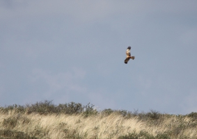 Alweer een mooie dag! Vandaag ben ik weer op zoek gegaan naar de Blauwe Kiekendief man. Omdat we de avond ervoor nog even naar het strand waren gegaan, had ik een andere plek ontdekt om het te gaan proberen: het gebied tussen de vakantiedorpjes Midsland aan Zee en West aan Zee. Hier liggen verschillende zoetwater plassen, “plakken” op zijn goed Terschellings, waar het best eens interessant zou kunnen zijn. Ik ben begonnen aan mijn wandeling ten oosten van Midsland aan Zee. Ik heb een heel stuk door de duinen gelopen waar ik niemand tegenkwam, heerlijk rustig! Vogels kwam ik alleen ook niet zo heel veel tegen, alleen Tapuiten welke zich nauwelijks lieten zien, er vlogen wat verschillende Meeuwen over, een Buizerd en uiteindelijk een Bruine Kiekendief. Deze vloog over en verdween richting het westen. Ik ben dus nog een stukje verder gelopen en ergens in de duinen gaan zitten. Ik zag toen die Bruine Kiek boven de “Waterplak” en het leek of hij redelijk in de buurt kwam van iemand die daar aan het schilderen was. Of je nou schildert of fotografeert, dat weet die Bruine Kiek toch niet, dus ben ik ook naar de plas gelopen en gaan zitten op een duin.