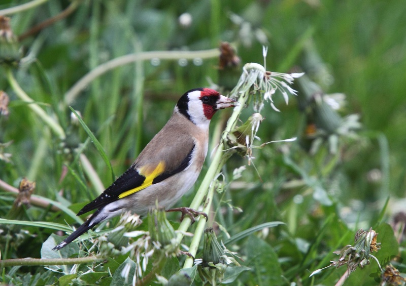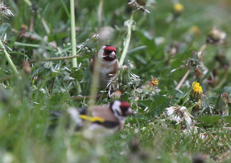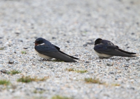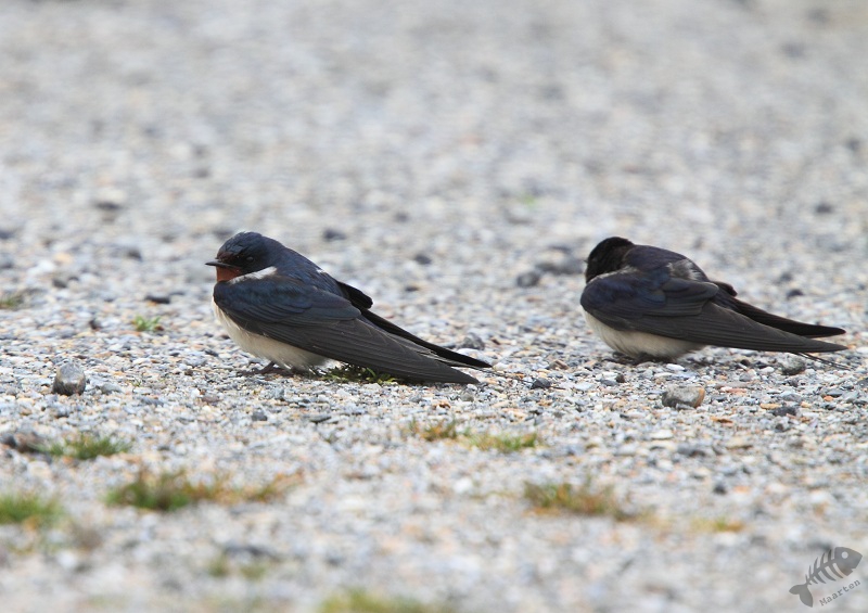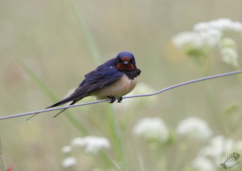 Helaas: onze laatste dag en het was begonnen met regenen. Ondanks dat ben ik in de ochtend nog even op weg geweest: ik bleef hopen op de Blauwe Kiekendief… In de polder ben ik hem niet tegengekomen, maar wel weer verschillende, doornatte, Grutto’s en Tureluurs. Ook vlogen er weer veel Boerenzwaluwen rond. Er zaten er 2 op het pad waar ik heen wilde. Ze leken uitgeput, misschien door de harde wind, zodat ik maar een andere weg genomen heb. Ik kwam toen bij een veld waar een hele vlucht Zwaluwen aan het jagen was. Af en toe bleef er eentje op het prikkeldraad zitten en had ik de gelegenheid om eens een mooie foto van deze mooie soort te maken. Daarna ben ik binnendoor naar het huisje teruggereden en zag ik 2 vogeltjes op de grond. Het bleken Putters te zijn die van de zaden van Paardenbloemen aan het smullen waren. Ze bleven heel mooi zitten totdat er een auto voorbij kwam. Deze ontmoeting was meteen mijn laatste wapenfeit. We hebben een boot eerder teruggenomen, omdat het weer wel heel slecht leek te worden.