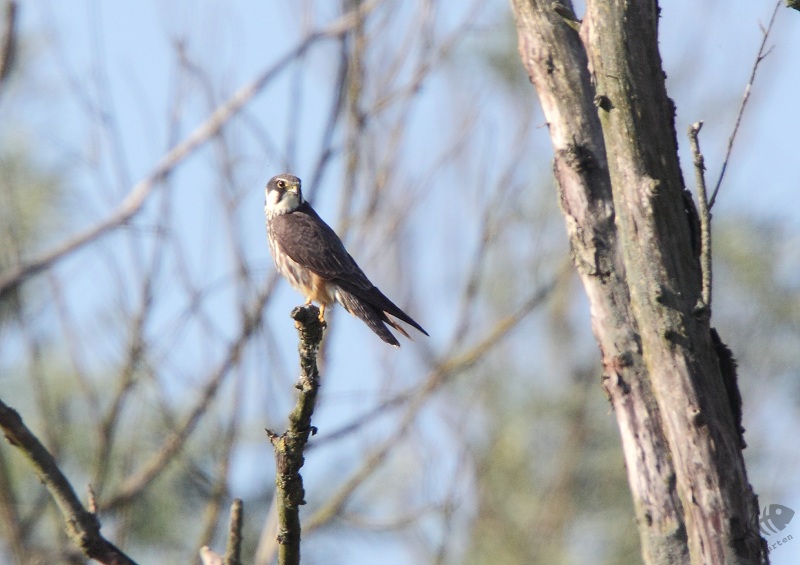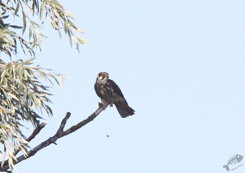 Bij een vennetje niet zo ver van het bruggetje zat een Bosrietzanger luid te zingen. Ik heb een tijdje aan de kant van het gele bloemenveld gestaan in afwachting of hij misschien wat dichterbij zou komen, maar dat deed hij niet. Toen ik weer verder wilde gaan vloog er iets heel snel voorbij en ging verderop in een boom zitten. Ik had niet meteen in de gaten wat het was, maar toen ik goed keek bleek het een Boomvalk te zijn! Ik kon zelfs wat dichterbij komen, maar dan vloog hij weer op om te jagen en zo zag ik hem in een andere boom iets zitten eten. Hierbij had hij heel mooi licht op zijn kop: het bleek een aardig plaatje… Na nog even daar gestaan te hebben en nog een vlucht te zien, ben ik naar de auto gelopen.