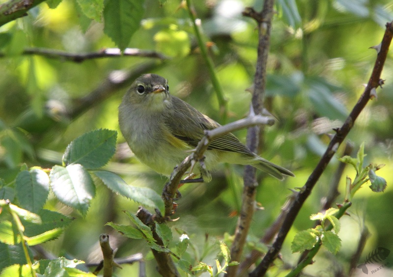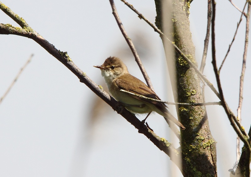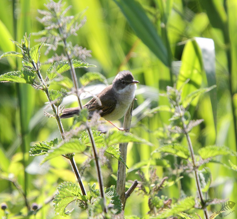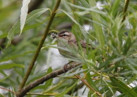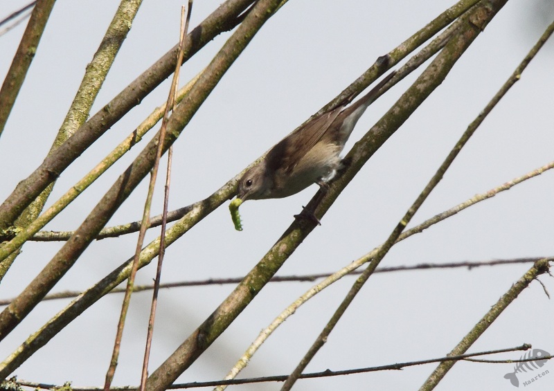 Aangekomen in de hut had ik het zo’n beetje op orde en ik ben gaan staan wachten: misschien kwam die Blauwe Kiek nog een keer langs… Tijdens het wachten bleek er een Grasmus vlak voor de hut bezig een nest te bouwen: om de zoveel tijd kwam hij aangevlogen met pluisjes in zijn snavel. Ondanks het zware tegenlicht is het me toch nog gelukt hem mooi af te beelden. Gelukkig voor hem bleek zijn werk niet voor niets: na een tijd kwam er een vrouwtje meegevlogen en doken ze samen richting zijn nest.
