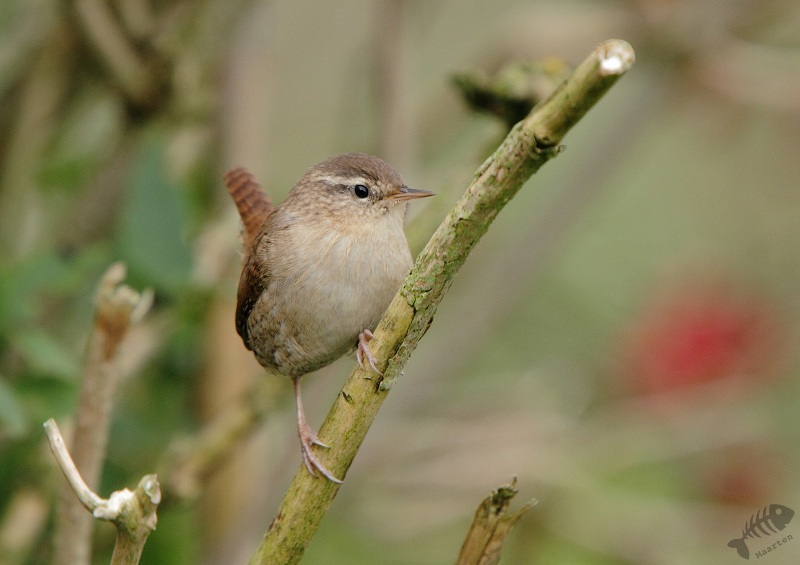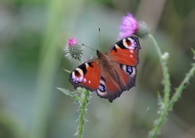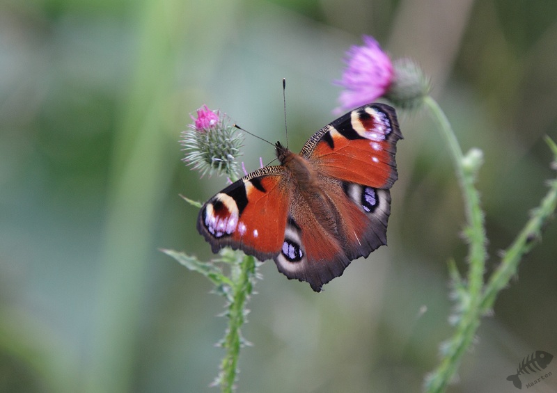 Ik ben dus maar weer teruggelopen en trof een Dagpauwoog op een Distel, altijd een mooi gezicht. Vanuit de hut Wigbels Eiland was hetzelfde tafereel te zien, verder bleef het rustig. Alleen kwam er een Winterkoninkje eventjes heel mooi zitten. Het wordt nog wel iets met mij en deze kleine opdondertjes…