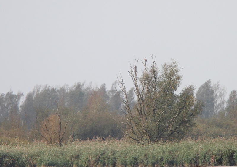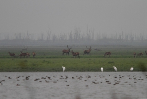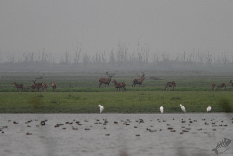 Onderweg naar de hut zag ik al een eerste verrassing: in het Wilgenbos zat een Visarend boven in de top van 1 van de dode bomen. Helaas zat hij wat ver weg, maar ik kon hem toch mooi zien. Ik ben verder gegaan naar Wigbels Eiland en het klopte wat ik verwacht had: het hele gebied stond vol met Edelherten. Het leken een aantal kuddes te zijn, groepen vrouwtjes met enkele mannetjes. De mannetjes waren inderdaad volop aan het burlen. Van alle kanten klonk het geloei. De afstand was erg groot en het licht niet zo best, dus ik heb niet zo’n mooie foto’s kunnen maken, maar het was in ieder geval een machtig gezicht.