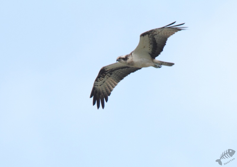 Natuurlijk moest ik wel weer eventjes stoppen bij de hut aan de Keersluisplas. Aan de overkant van het water zag ik weer iets in de top van een boom zitten: weer de Visarend op grote afstand. Ik had bedacht dat het wel iets voor hem zou zijn in de plas te gaan jagen en dan kon ik dat mooi vastleggen… Ik bleef nog maar even wachten. In die tijd kwam er een medevogelaar binnen en we stonden eventjes te praten, toen ik weer naar buiten keek en zag dat de Arend recht op de hut afvloog! Snel naar buiten gelopen en wat foto’s gemaakt. Helaas bleek mijn camera niet helemaal goed te staan en waren de foto’s dus niet optimaal. Ik ben weer terug de hut ingegaan en heb weer wat staan praten en besloot om maar weer verder te gaan. Op het moment dat ik de hut weer uitliep, kwam de Visarend weer laag over en dit keer stond wel alles goed. Het lukte me dus heel aardige foto’s te maken! Eerst die Slechtvalk en nu deze Visarend, mijn dag kon niet meer stuk.