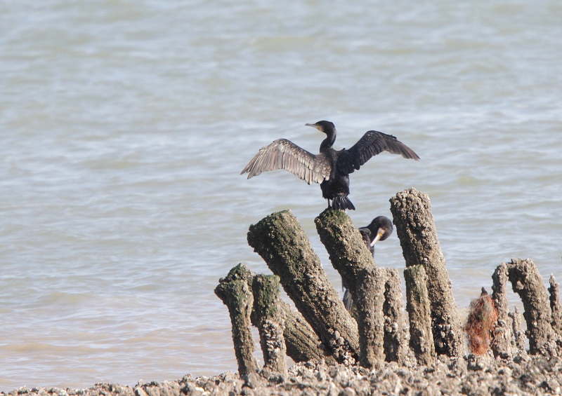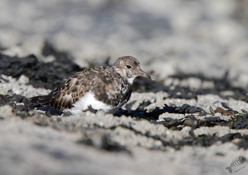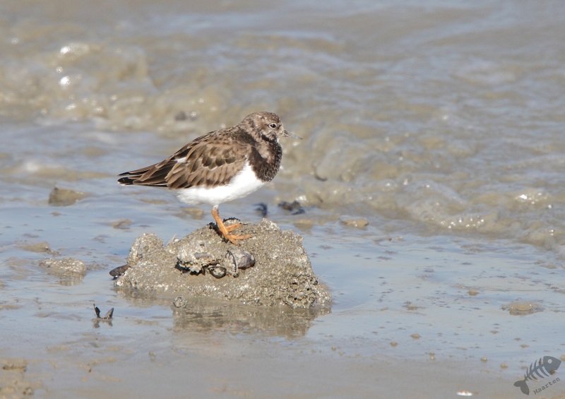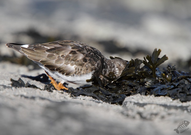 Ik ben verder gelopen langs de Westerschelde en trof daar nog een Aalscholver in karakteristieke houding. Toen ik terugliep naar de auto, zag ik een aantal Steenlopertjes druk bezig met foerageren. Drie die meer langs het water bezig waren, waren redelijk schuw, maar eentje die op de dijk bezig was, kwam steeds dichter naar me toe en ik kon mooi zijn voedselzoeken bekijken. Al het wier op de kant werd minutieus doorgewoeld en af en toe zag je hem er iets uit wegpikken.
