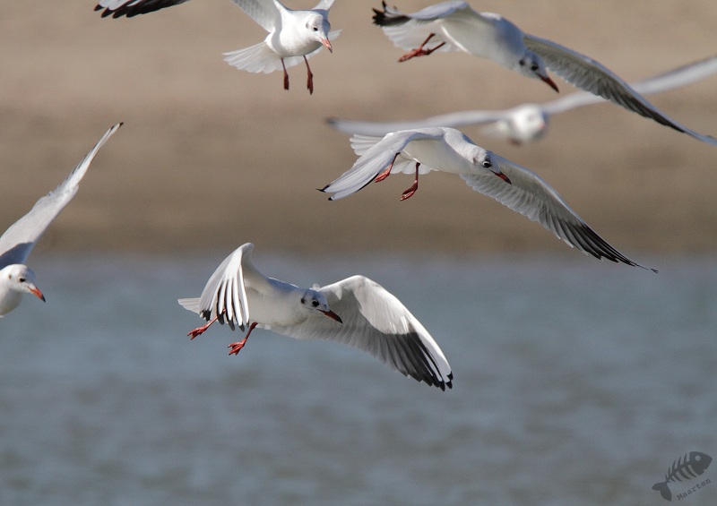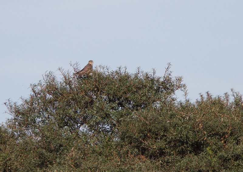 Boven en in de slufter was een groep Kokmeeuwen bezig voedsel te zoeken. Ik ben wat verder het strand op gegaan, maar daar liepen te veel mensen, dus ben ik teruggegaan en heb het vlonderpad naar de duinen gevolgd. Eerst zag ik hier een Torenvalkje staan bidden, maar heel ver achter haar zag ik iets anders: een Rode Wouw trok voorbij. In de duinen werd ik al snel verrast door iets wat daar aan het jagen was. Ik kon het in eerste instantie niet goed zien, maar toen zij verderop boven op een struik ging zitten, zag ik wat het was. Het bleek een Smelleken te zijn. Ik heb haar een tijdje staan bekijken en heb enkele foto’s gemaakt, waarna ze weg vloog, weer op jacht. Ik kon niet zien waar ze heenging en heb haar helaas niet meer gezien.