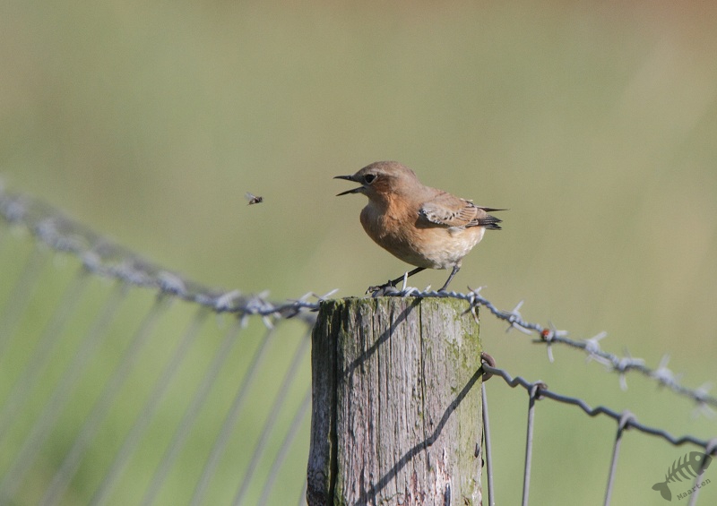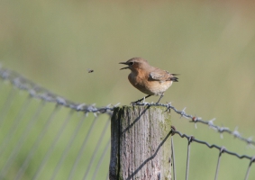 Vanuit de Braakman was mijn eerste stop richting Breskens bij Hoofdplaat. Daar was een natuurgebiedje langs de Westerschelde waar ik eerst heen ben gegaan. Ik was net de dijk over toen er al een leuke verrassing zat: een Tapuit zat mij op te wachten op een paaltje en ik kreeg direct de gelegenheid om van deze “wenssoort” (ik verzin nu ter plekke een nieuw woord voor mij, soorten die ik graag nog mooi wil zien/fotograferen is een wenssoort) mooie foto’s te maken. Op eentje zie je bijna zijn lunch zijn snavel invliegen…