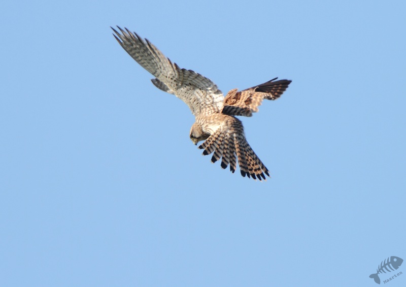 Vandaag zouden we weer naar huis gaan. Gelukkig gingen we pas laat in de middag en had ik de ochtend nog om de Braakmanpolder eens goed te bekijken. Eerst ben ik naar de Noordwest kant gegaan. Ook daar zou een observatiewand moeten zijn. Op de weg ernaartoe had ik enkele Groene Spechten gezien en een Torenvalkje. In het bosje waar het pad naar de wand doorheen liep, zaten ook Spechten en zag ik een paar Kramsvogels. Vanaf de observatiemuur was jammer genoeg niet zo heel veel te zien. Ik keek uit over de Braakmankreek en zag in de verte wel enkele Canadese Ganzen en Kokmeeuwen. Verder zat er niets en zeker niet fotografeerbaar. Ik ben weer terug naar de auto gelopen en daar zat wel weer iets leuks: een Klapekster zat zoals een Klapekster moet zitten: helemaal in de top van een struik. Helaas was het weggetje een beetje druk, dus hij vloog weg. Vanuit de auto heb ik daarna nog wel een paar mooie foto’s van een biddende Torenvalk kunnen maken.