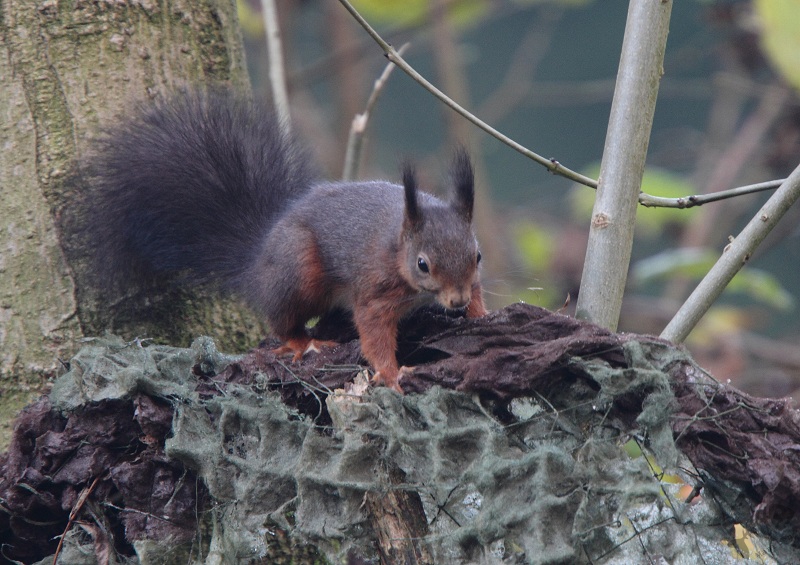 Voordat het te donker werd om te fotograferen, verscheen er ineens iets bij een boom wat verder achter in beeld. Ik kon niet zien wat het was, maar het leek zwart en harig… Een Boommarter, een man met zwart haar? Na een tijdje wachten of het zich nog zou laten zien verscheen er iets meer in beeld en bleek het een hele donkere Eekhoorn te zijn. Ik had gezien dat ook hiervan foto’s waren gemaakt, drinkend uit de vijver, maar deze keer bleef hij op afstand en verdween na een tijdje weer.