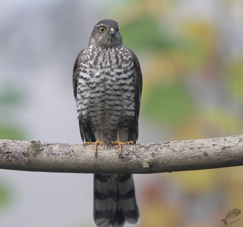 Han had me verteld dat je ook vanuit de hut voorzichtig moet bewegen: zeker wanneer ineens alles weggevlogen is, of wanneer er alarmroepen klinken moet je niet of heel voorzichtig met je camera bewegen. Het kan zijn dat er dan een Sperwer of Havik in de buurt zit. Na zo’n 2 uur was het ineens weer helemaal stil: er was een Sperwer op de tak wat verder achterin geland. Heel voorzichtig heb ik mijn camera op hem gericht en heb enkele foto’s kunnen maken, maar na ongeveer een halve minuut vertrok hij weer. Ik wil geloven dat het niet aan mij lag, maar ze zijn uiterst alert en hebben zulke scherpe ogen…