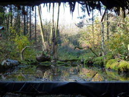 Toen ik net even aan een boterham zat werd het ineens weer stil. Snel keek weer naar buiten en zag direct wat de reden van de onrust was: een Buizerd was op dezelfde plaats gaan zitten als waar de Sperwer eerst zat. Grappig om te zien was dat de kleine vogeltjes vrijwel direct weer terugkwamen naar het vijvertje. Ze leken te weten dat zij niet de eerste aangewezen prooi waren. Na een tijdje vloog de Buizerd over de hut weg. Ik heb een hele tijd zitten wachten of hij terugkwam maar er gebeurde niks. Totdat opeens vanachter de hut de Buizerd naar beneden kwam zeilen en iets leek te slaan. Door de rand van de vijver kon ik het niet zien, maar hij steeg direct op en door en ging verderop op een tak zitten en leek aan iets te plukken. Door het licht en de vele takken die ervoor zaten, kon ik het niet goed zien.