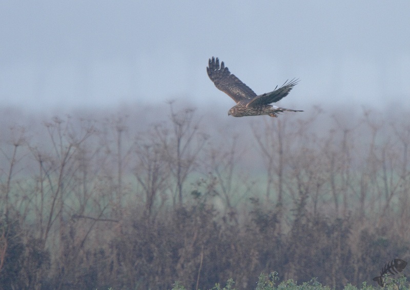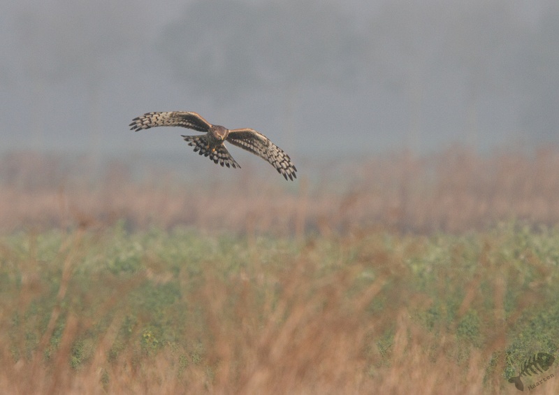 Om iets over 9 was ik bij de bekende velden (je mag er pas komen na 9 uur) en zag direct een Blauwe Kiek vliegen! Ze zaten er weer, dus de uitdaging om een mooier plaatje te krijgen dan de vorige keer kon beginnen. Het lastige is natuurlijk een plek uit te zoeken. Wanneer je op de ene plek gaat staan, lijkt het altijd of ze juist naar die andere vliegen. Ik ben ongeveer halverwege het veld gaan staan, op de grens van 2 begroeiingen. Het was nog wat mistig, maar gelukkig leek het in de verte vanuit het zuiden op te klaren. Na iets meer dan een uur verscheen de eerste Kiek dicht genoeg bij om foto’s te gaan maken. Het was nog steeds mistig, maar voor de sfeer was dat juist wel mooi.