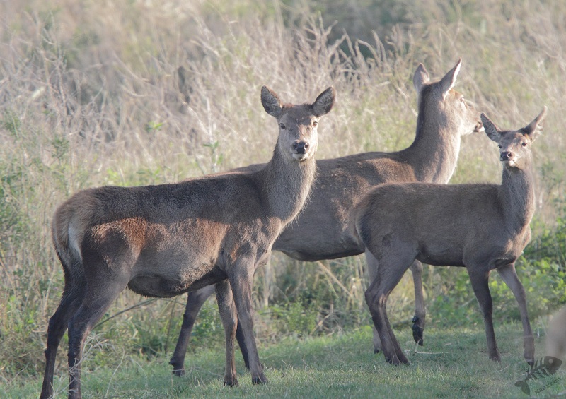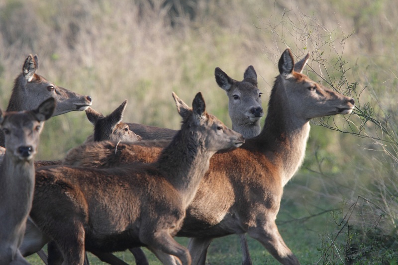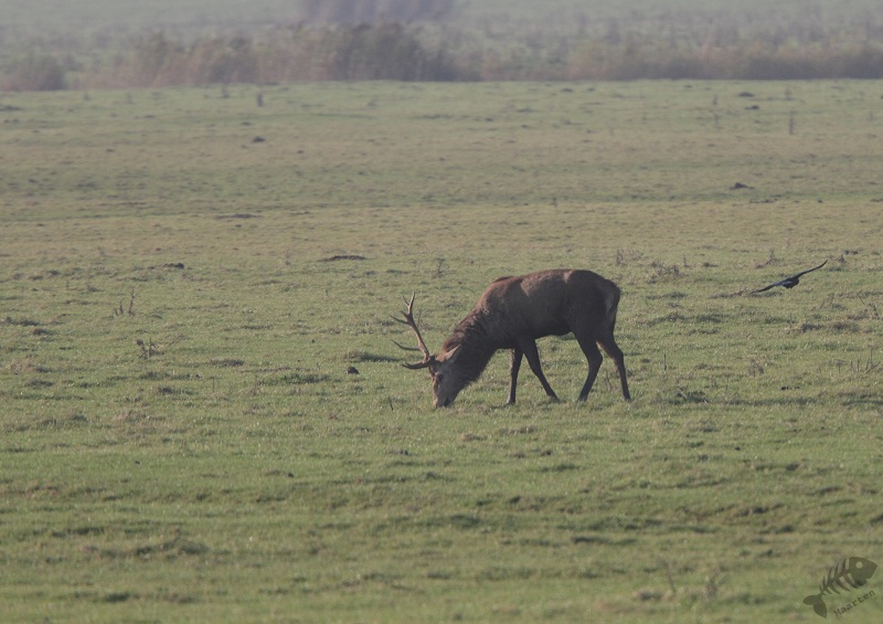 Deze keer ben ik eerst naar de Brandgans gelopen. Vanuit deze hut was eigenlijk niets te zien. Er stond een Edelhert te grazen, maar daar bleef het bij. Toen ik terugliep naar Wigbels Eiland, hoorde ik redelijk luid gekraak en geritsel uit het struikgewas rechts van me. Toen ik keek bleek het een kudde Edelherten te zijn welke recht op me afkwam. Ik ben snel doorgelopen en verderop gaan staan en heb me omgedraaid en de camera neergezet. Even daarna stak de kudde het pad over en hoorde ik ze verderop het water ingaan, tegenover de Brandgans. Ik had dus enorm spijt dat ik niet 2 minuten langer was gebleven: ik had dan een mooi uitzicht gehad alsof je naar Gnoes op trek aan het kijken bent die een rivier oversteken.