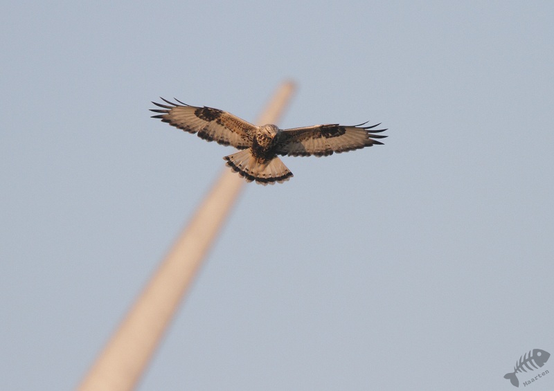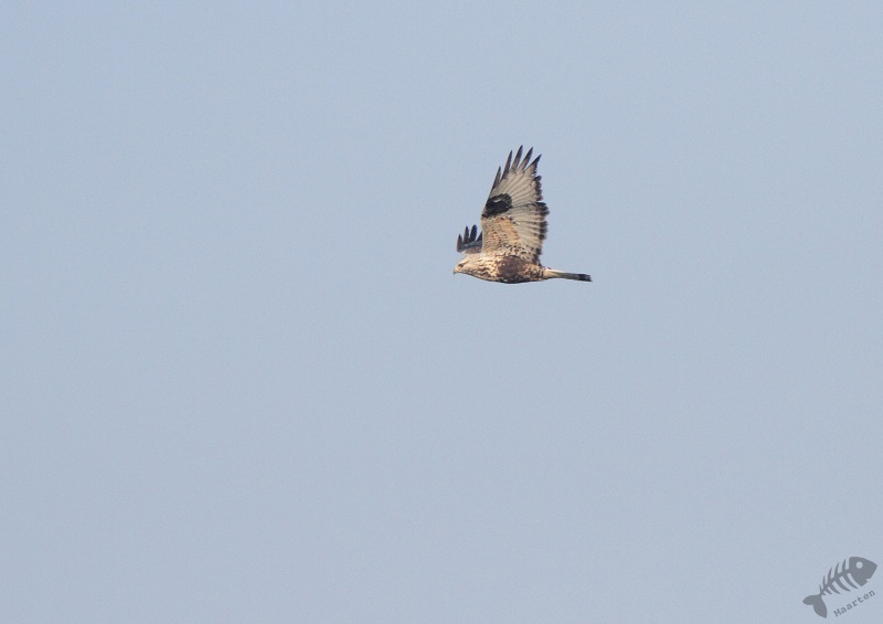Omdat het nog redelijk vroeg was en nog mooi licht, ben ik maar teruggereden naar het veld met de Blauwe Kiekendieven in de Polder. Gelukkig wilde een exemplaar redelijk meewerken, maar een Ruigpootbuizerd wilde zich echt even mooi laten zien. Hij kwam steeds dichterbij staan bidden. Toen de zon echt al aan het ondergaan was, vloog er nog een Buizerd op een verkeersbord langs de kant van de weg waar wij (een aantal andere fotografen en ik) stonden. Toen 1 van die fotografen dichterbij reed, bleef hij gewoon zitten. Ik ben gaan volgen en de Buizerd bleef hele tijd zitten, ondanks dat we behoorlijk dichtbij kwamen. Op een bepaald moment kwam de fotograaf naast me staan en vroeg of ik hem vliegend wilde: hij moest weg en waarschijnlijk bleef de Buizerd niet zitten als hij er langsop reed. Dat was inderdaad zo: hij vloog direct weg, maar vanwege het licht kreeg ik hem niet zo mooi… Maar met een aantal mooie plaatjes van deze prachtige soort ben ik weer naar huis gegaan, een aantal vragen onbeantwoord… (waar waren de foto’s van de Watersnippen en Klapekster gemaakt, hoe laat ik de Blauwe Kiekendieven dichterbij komen…?)