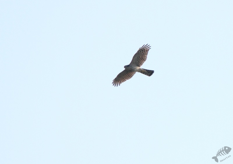 Ik ben dan ook maar verder gelopen en hoorde in het bosje rond deze hut hoog gepiep. Het leken Vuurgoudhaantjes te zijn, maar ze waren zo bewegelijk en zaten dusdanig verscholen dat ik niet zeker ben of het deze of gewone Goudhaantjes waren. Boven het veld langs het Wilgenbos, vloog er een Sperwer voorbij, maar ook hier was het rustig.