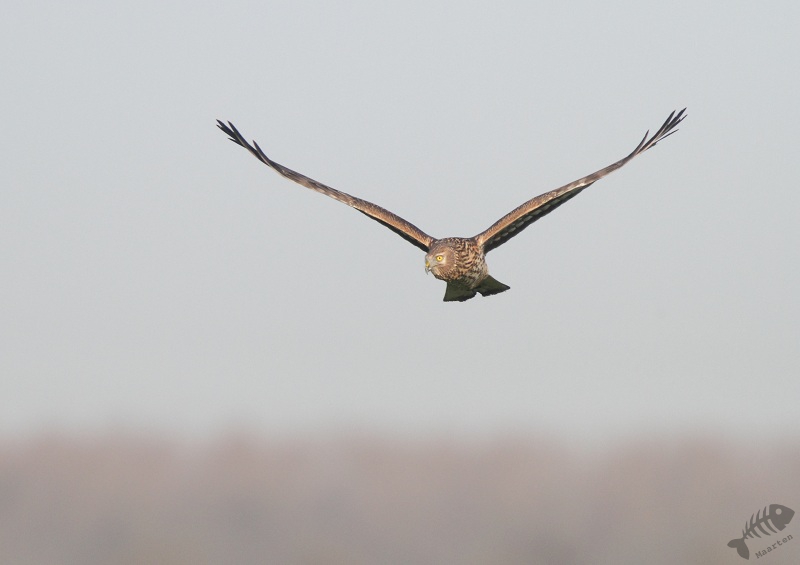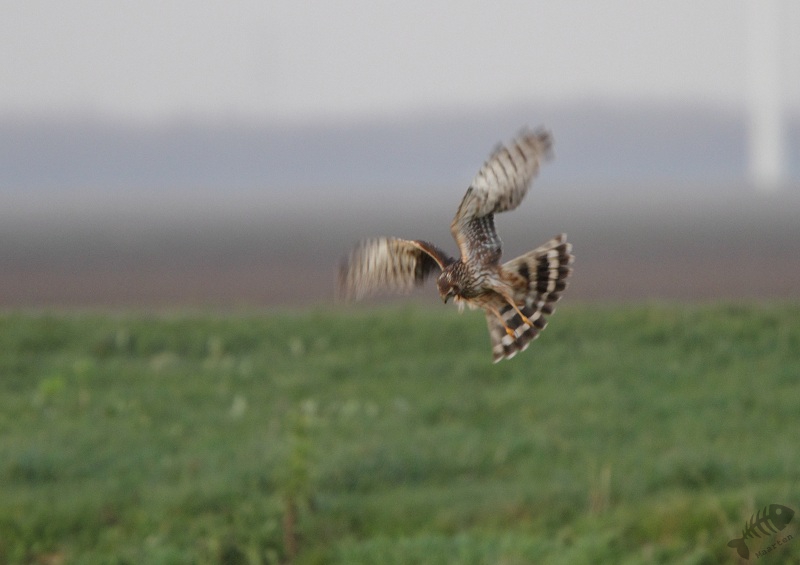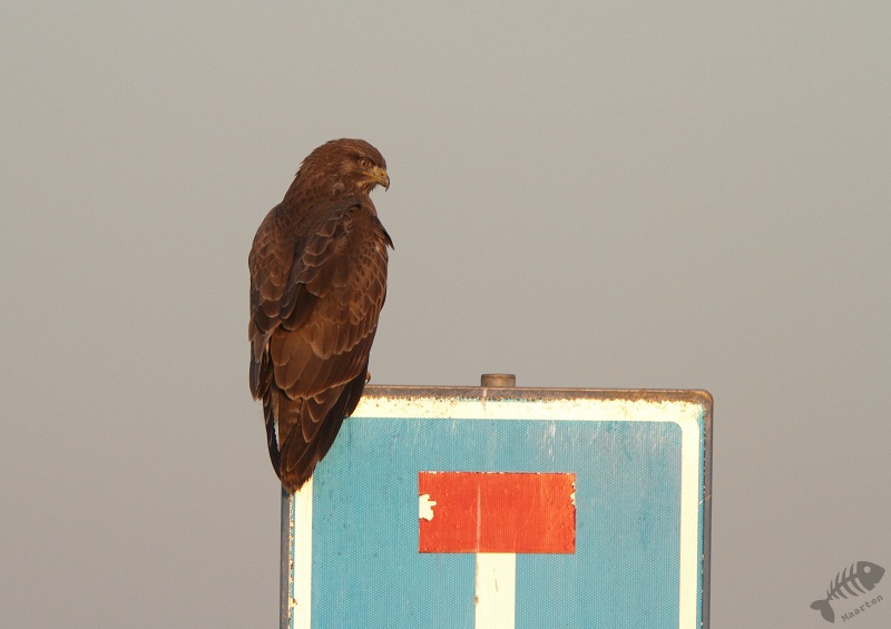 Die was er nauwelijks. Wel kwam de bekende Buizerd weer dichtbij zitten en later op een verkeersbord, maar de Kiekendieven waren er niet. Na de Buizerd op de foto gezet te hebben, wilde ik gaan: de zon was al een heel eind onder en je mag daar maar rondrijden tot 15 uur… Maar toen ik bij een 2de zijweg kwam, zag ik opeens verschillende Kiekendieven rondvliegen! Er was een vergelijkbaar veld waar ze zich blijkbaar ophielden. Ik ben dus (stiekem) deze weg nog ingereden en heb nog een tijdje staan genieten van de verschillende jagers aan het werk: er zaten ook Ruigpootbuizerden en een Torenvalkje. Jammer genoeg was het eigenlijk te donker om foto’s te maken, maar 1 of 2 leken nog wel de moeite waard.