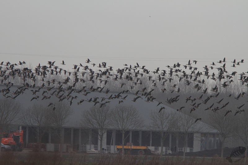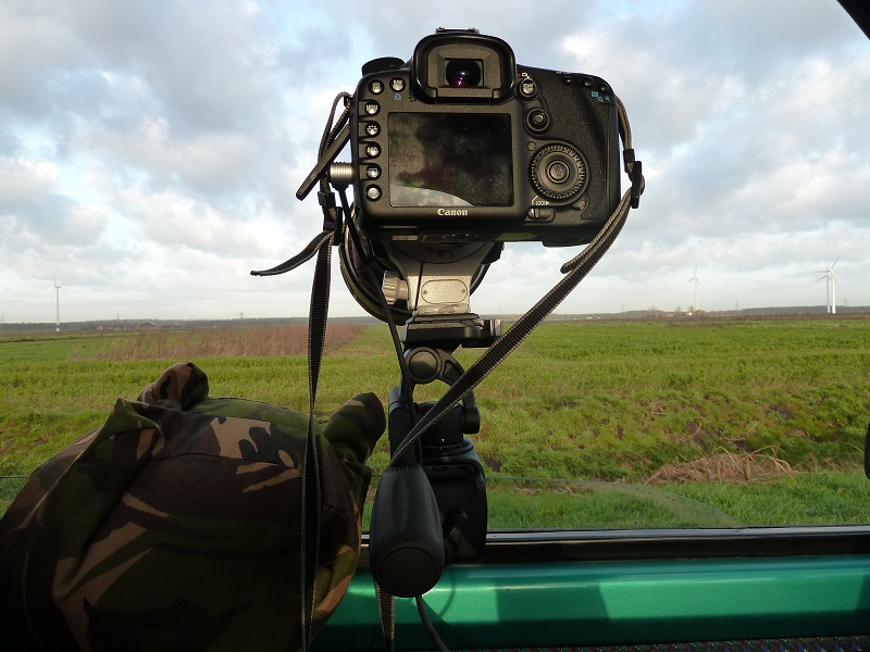 Iets na 9 uur was ik weer aanwezig. Ik was weer de eerste en het was nog een beetje mistig en somber. Een klein uur bleef het zo, maar toen zag je af en toe de zon doorbreken in het zuiden. De vogels lieten het alleen behoorlijk afweten. Pas om 11 uur heb ik mijn 1ste foto gemaakt: een enorme groep Grauwe Ganzen welke opvlogen (verjaagd werden?) vanaf een veld een heel stuk verderop. Na weer een half uurtje kwam de 1ste Blauwe Kiek. Het was eigenlijk nog een beetje te donker, maar ik heb toch enkele foto’s kunnen maken. Het statiefje werkte heel behoorlijk: ik kon rustig meedraaien en veel geleidelijker bewegen. Een nadeel was wel dat, omdat de auto wat scheef stond, m’n camera ook scheef kwam te staan naarmate ik verder draaide. “Gelukkig” had ik vervolgens weer een uur om de opstelling te verbeteren. Ik heb het statief op de deur gezet en de gondel losgezet zodat ik de camera kon draaien ten opzichte van het statief.