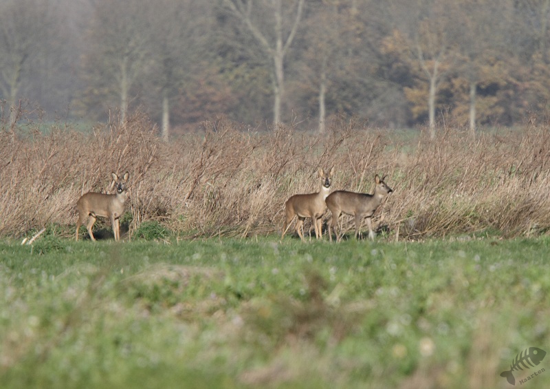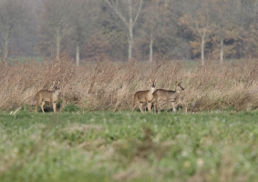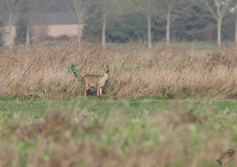 Na dit uur puzzelen verscheen er weer een Blauwe Kiekendief. Deze begon wat verderop te jagen, maar kwam steeds dichterbij. Op het einde vloog ze echt dichtbij en leek ze zich niet te storen aan mij in de auto: het leek te werken! Toen deze Blauwe Kiek weer weg was zag ik in de verte iets staan wat ik niet thuis kon brengen. Toen ik door de verrekijker keek bleek dat er een groepje reeá«n in het veld stond. Ondanks dat ik nauwelijks bewoog of geluid maakte, waren ze enorm op hun hoede en liepen langzaam weg door de hogere begroeiing. Hierna vloog er nog een Buizerd op, welke een tijdje op de grond was blijven zitten. Helaas was ik net te laat om er mooie opnamen van te maken. Tegelijkertijd met deze Buizerd kwam er in de verte een Ruigpootbuizerd staan bidden. Hij kwam steeds een beetje dichterbij, en niet al te ver van de auto zag ik hem mooi duiken naar een prooi. Gelukkig voor de muis bleek hij niks gevangen te hebben.