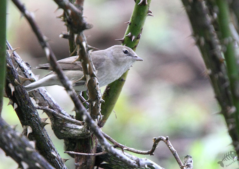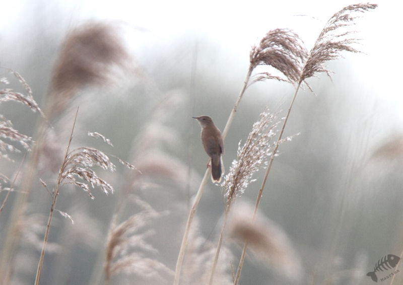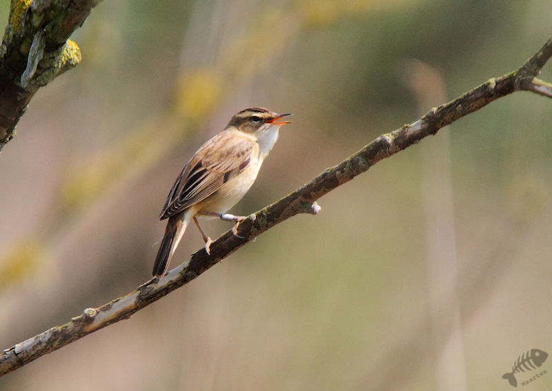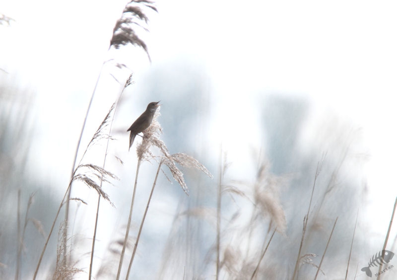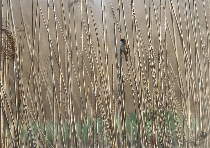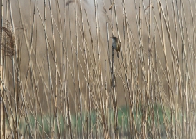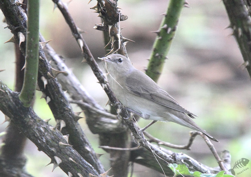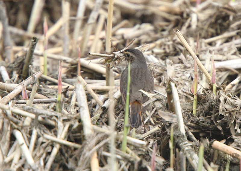 Ik was rond 7 uur bij het bezoekerscentrum en ben direct gaan lopen. Het grote gedeelte was weer geopend dus ik kon weer even vooruit. Bij de bruggetjes zaten weer verschillende Rietzangers. Deze ochtend wilde ze alleen niet zo mooi poseren, dus ik ben vlot weer verder gelopen. Al snel hoorde ik vanuit het Wilgenbos de zang van de Gekraagde Roodstaart. Net als vorig jaar zat het mannetje hoog in één van de kale, hoge stammen voluit te zingen. Verder was het rustig en ben ik doorgelopen naar Wigbels Eiland. Vorig jaar zat daar een Grasmus en ik hoopte dat hij zijn stekje daar weer had en dat ik hem nu misschien zingend zou treffen. Helaas. Staatsbosbeheer was blijkbaar in de wintermaanden enthousiast aan het snoeien gegaan en er stond geen grasspriet of struikje meer bij de hut. Het uitzicht was nu wel vrij, maar daar heb ik niet zo veel mee… Wel hoorde ik links van de hut een prachtig volle zang. Omdat vorig jaar het vrouwtje van de Zwartkop hier ook zat en de zang hier op leek, dacht ik dat het nu een mannetje zou zijn. Het duurde een hele tijd voor hij zich liet zien, alleen…: het was geen Zwartkop maar een Tuinfluiter. Ik heb altijd gedacht ik de zang van deze soorten makkelijk uit elkaar zou kunnen houden, maar blijkbaar was dit niet het geval. Toen ik hem eenmaal gezien had, klopte het wel, maar ik had het direct moeten horen. Het mannetje was blijkbaar druk met het verzamelen van nestmateriaal, want hij vloog regelmatig naar de grond om strootjes op te pikken. Op deze manier kon ik hem mooi zien en eindelijk eens mooi vastleggen.