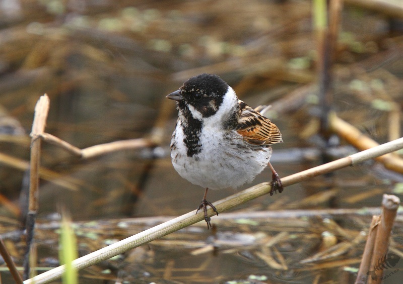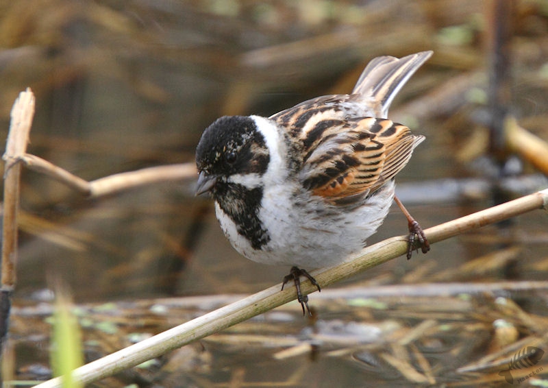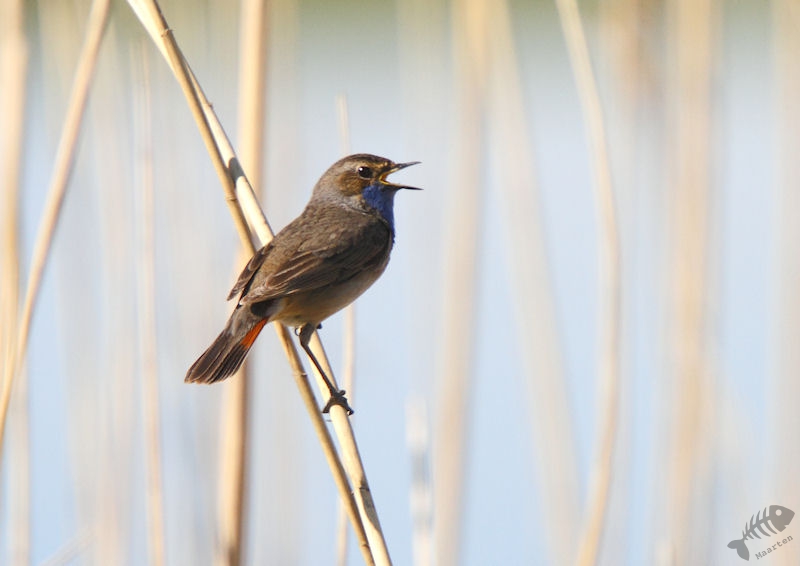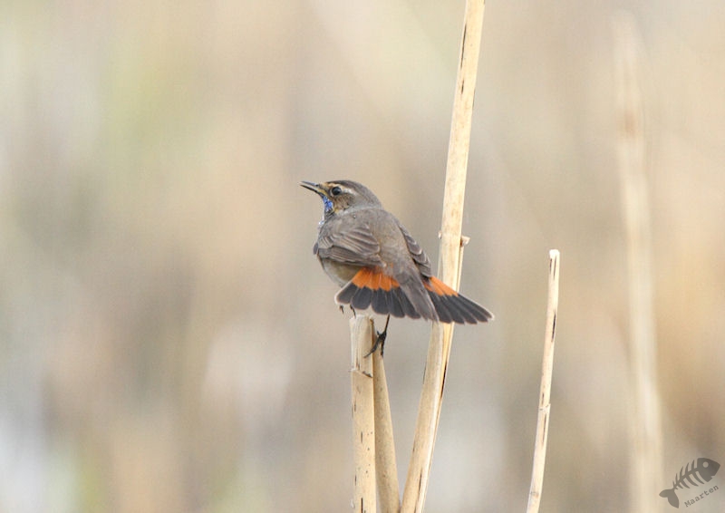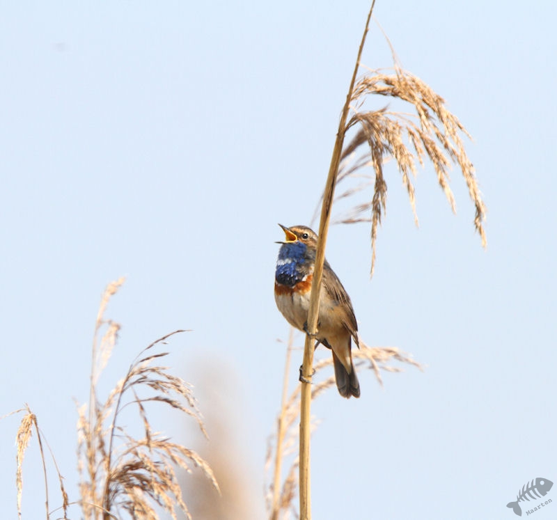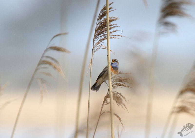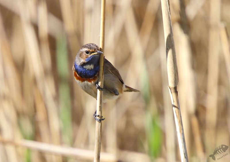 Al snel bleek dat er een Blauwborst actief bezig was voor de hut. Dit was ook niet vreemd: een vrouwtje scharrelde voor de hut rond met nestmateriaal in haar snavel. Ze was bezig een nest te maken onder een hoopje afgesneden riet en hij was druk de plaats te claimen. Heel eventjes kwam hij vlak voor de hut zitten en kwam hij heel mooi in beeld. In de tijd dat hij ergens anders druk aan het doen was, kon ik me vermaken met het vrouwtje, een Witte Kwikstaart vlak voor de hut (net als vorig jaar), Bergeenden verder op het water en een Rietgors welke heel dicht in de buurt van de hut aan het foerageren was. Grappig was dat hij tijdens het rondpikken zijn deuntje af en toe liet horen.
