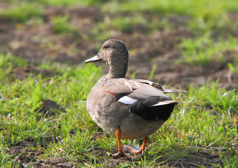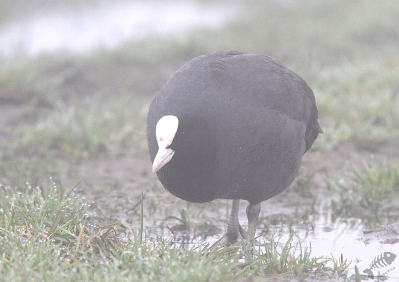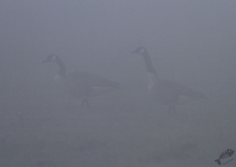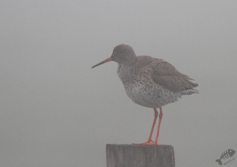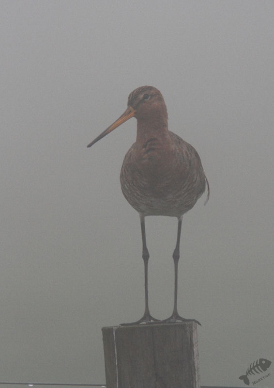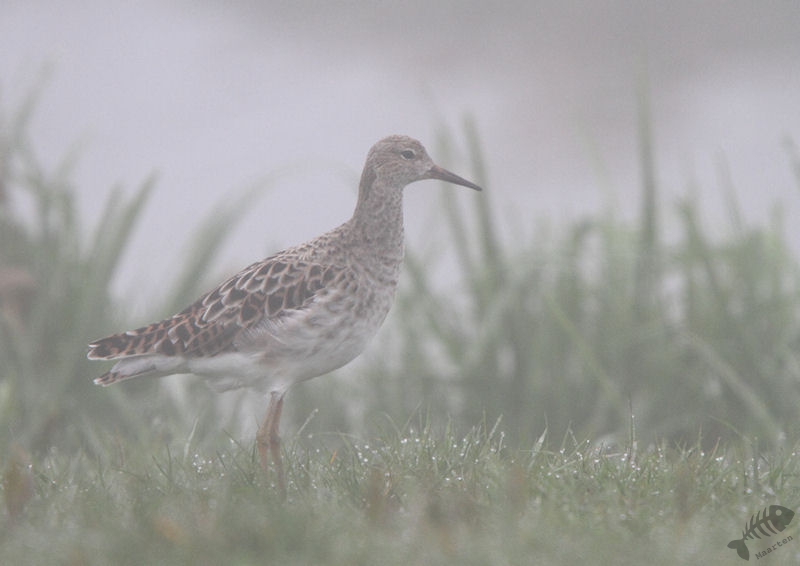 Gelukkig hoorde ik wel de Grutto’s roepen, zaten er Tureluurs, Slobeenden en Grote Canadese Ganzen. Toen ik bezig was (wazige) foto’s van deze laatste soort te maken, zag ik een vogel die ik niet direct kon plaatsen. Toen ze wat dichterbij kwam, bleek het een vrouwtje van de Kemphaan te zijn. Dit was een nieuwe soort voor mij en ik was dus erg in mijn nopjes dat ik haar had gevonden. Door de mist werden de foto’s niet per se duidelijker, maar ze stond er op.