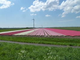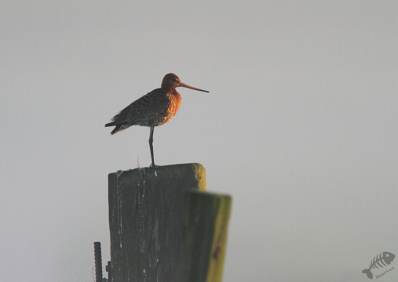 Net als 12 april was het mistig… Weer zag ik maar weinig, maar de zonsopkomst maakte heel veel goed! Toen ik de auto neergezet had en onder het genot van een bakkie naar de zon zat te kijken, zag ik een vogel vlak voor me rond aan het scharrelen. Toen ik beter keek bleek het een Gele Kwikstaart te zijn. Ik had deze soort een hele tijd geleden voor het laatst gezien en had hem toen ik vastgelegd (dit was in de Millingerwaard). Nu liepen er 2 vlak voor me rond, maar was het mistig… Toch ben ik maar wat foto’s gaan maken en op enkele was in ieder geval goed te zien dat het om deze Kwikstaart gaat. Na het maken van een karakteristiek plaatje in de polder (een Grutto op een paal), ben ik doorgereden naar de Oostvaardersplassen. Onderweg kon je zien waar Nederland bekend om staat: Tulpenvelden! door heel de polder.