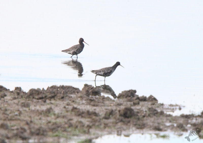 Vanuit de hut had je dus een wijds uitzicht over de Oostvaardersplassen en waren de enorme aantallen Ganzen en Kieviten te zien. Maar op de plek waar ik eerder een Groenpootruiter had gezien zat nu iets anders. Het was lastig te zien (je hebt al snel tegenlicht vanuit deze hut), maar het lukte me toch ze te herkennen: Zwarte Ruiters. Ik kan me niet herinneren dat ik deze soort ooit eerder heb gezien, dus ik was hier zeer mee in mijn nopjes! Jammer dat ze eigenlijk net iets te ver weg zaten, en dat het licht dus moeilijk was waardoor ze moeilijk te fotograferen waren, maar ze zijn vastgelegd.