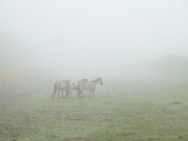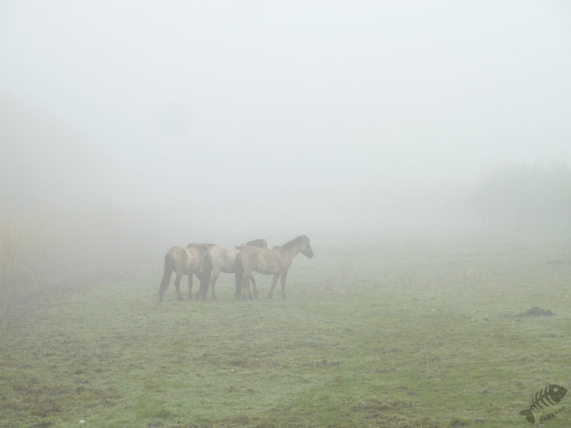 Nadat ik voldoende foto’s had, hoorde of zag ik geen nieuwe ontdekkingen meer en ben doorgereden naar de Oostvaardersplassen. Ook in de Flevopolder was het mistig. Ik heb de binnendoorroute weer genomen, zodat ik op de Praamweg uitkwam en via deze kant naar het bezoekerscentrum kon rijden. In het Oostvaardersveld, net voor de Wildroosters , stonden een paar Konikpaarden in de mist wat een prachtig plaatje opleverde…
