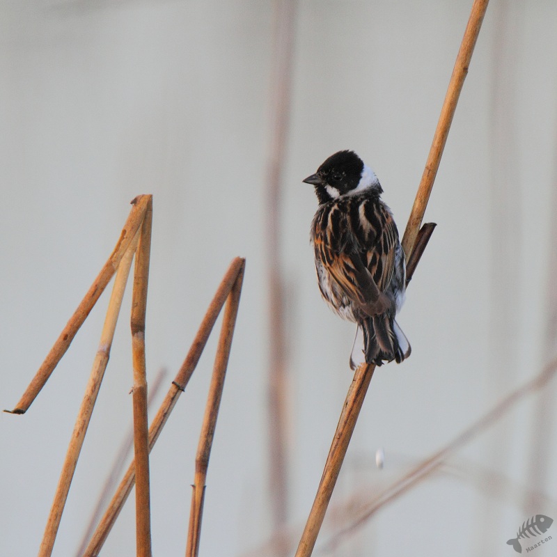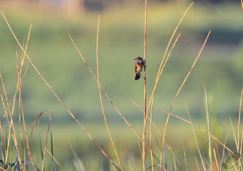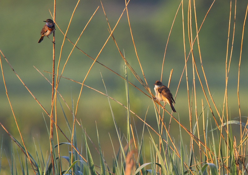 Toen de zon echt opkwam, werd het licht even heel mooi rood en kwam een Rietgors prachtig uit, zittend in het riet. Toen ik weer een tijdje naar een (Kleine) Karekiet had staan kijken en luisteren, kwam er ineens een andere vogel naast zitten. Ik kon het niet direct goed zien, maar hel bleek een Blauwborst te zijn. Grappig dat ik ze in 1 plaatje kon vangen.
