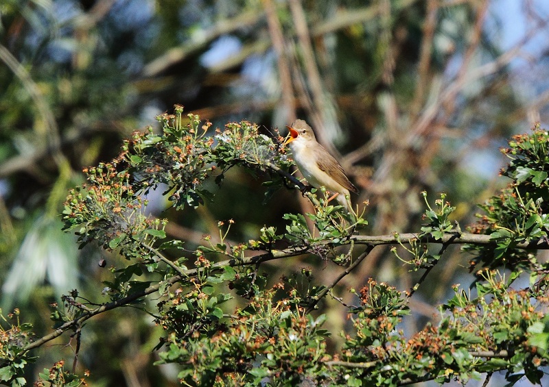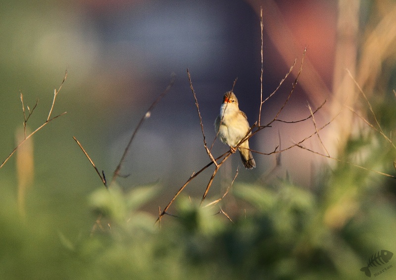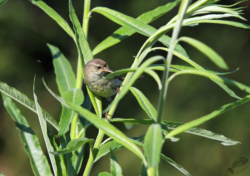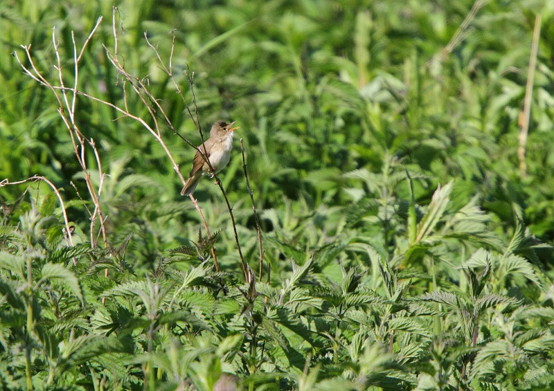 Omdat ik de Grote Karekiet niet zag of hoorde, ben ik al redelijk snel weer verder gelopen lans de Nevengeul. Overal om me heen hoorde ik Bosrietzangers. Eéntje ervan nam zelfs de moeite te blijven zitten tijdens het zingen, zodat ik hem aardig kon portretteren. Thuis bleek er alleen een heel naar takje precies voor hem te lopen…