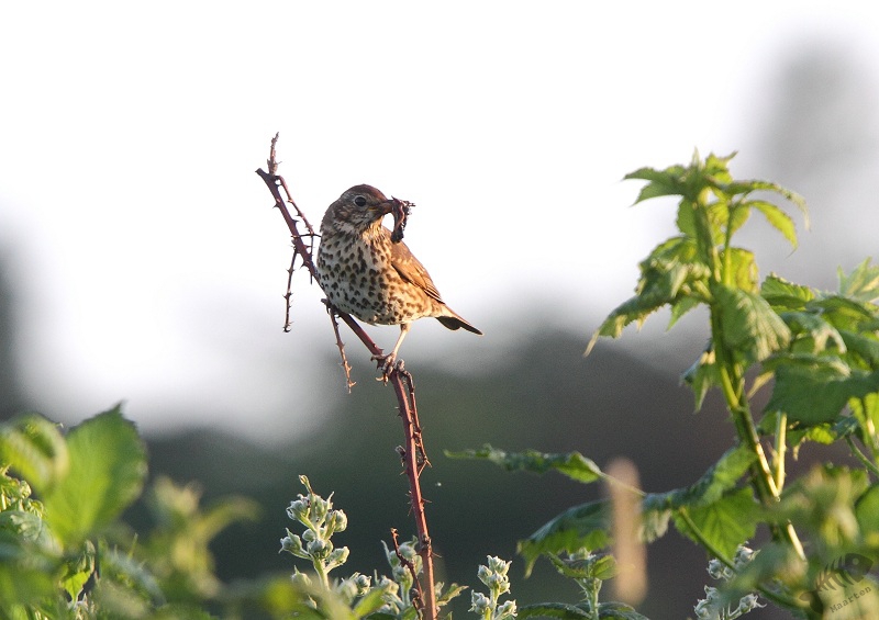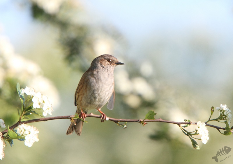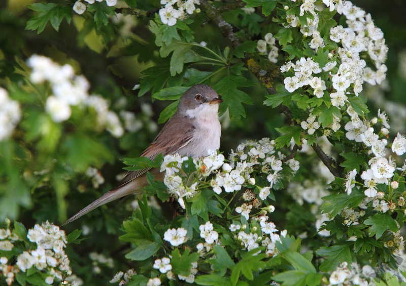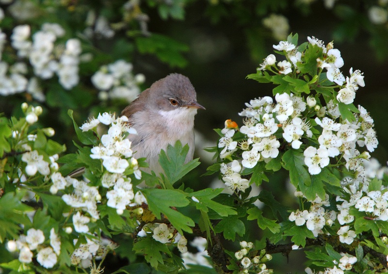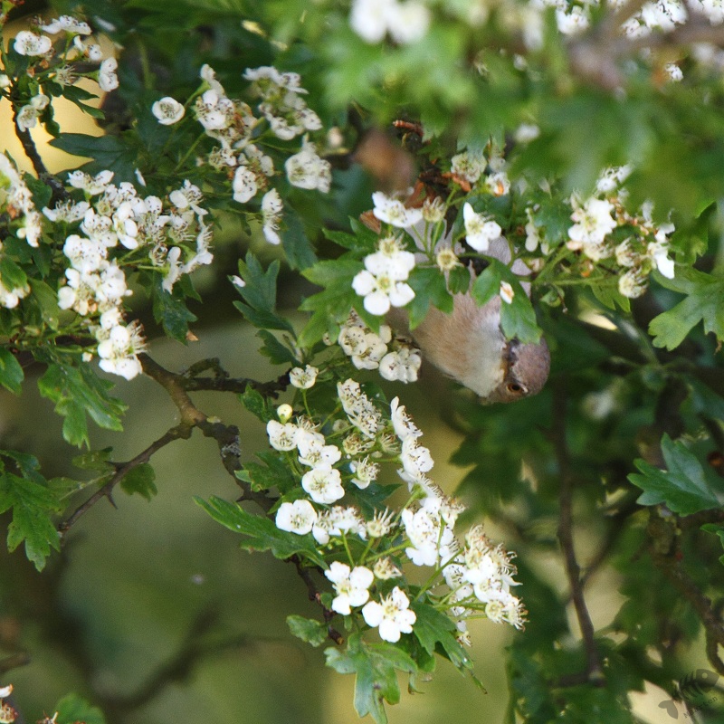 Na het ontbijt ben ik doorgelopen richting de Rijn. Ook hier klonken verschillende Bosrietzangertjes, Tjiftjafjes, Zwartkoppen en Grasmussen. Toen ik een tijdje stil stond om te zien of de Koekoeken zich lieten zien, kwamen er een Grasmus en Heggenmus volop zitten zingen. Zo tussen de bloeiende Meidoorns gaf dit wel een ultiem voorjaarsplaatje…