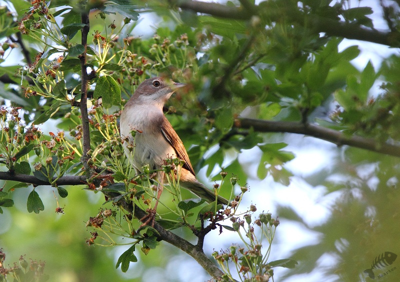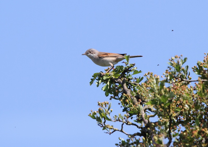 Tussen de dijk en het water zaten ook weer heel wat Bosrietzangers en Grasmussen. Ook zaten er Kneutjes, maar deze lieten zich nauwelijks zien. Bij het haventje was een Grasmus al zingend aan het foerageren en kwam van tijd tot tijd aardig vrij te zitten. Bij de bocht naar links, richting de Veerweg, ben ik weer even blijven staan omdat daar verschillende Zwaluwen regelmatig overkwamen. Het waren Gierzwaluwen, Oever- en Boerenzwaluwen. Toen ik daar zo stond, kwam ook hier een Grasmus in een Meidoorn heel mooi in beeld. Eindelijk eens écht mooie plaatjes van deze soort.