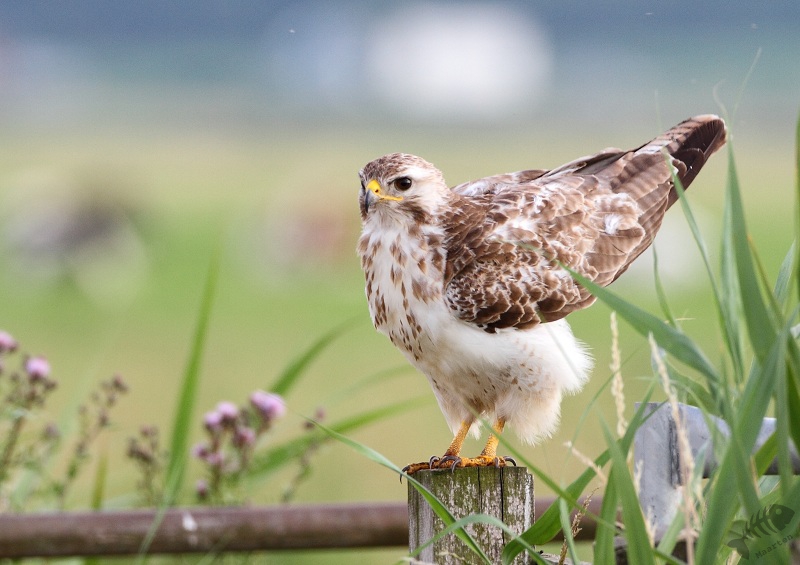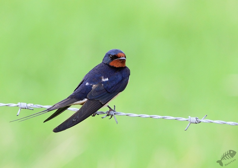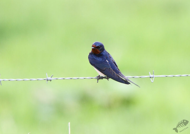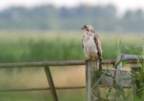 Toen ik de weg langs de dijk bijna afgereden had, zag ik een Buizerd zitten. Deze zat prachtig op de paal van een hek, wat een clichét beeld is, maar wel prachtige plaatjes opleverde. Zeker ook omdat het zo’n schitterend exemplaar was. Na een tijdje leek hij iets gezien te hebben in het weiland waar hij over uitkeek. Hij dook naar beneden, maar kreeg niks te pakken. Hij vertrok naar verderop en ik ben doorgereden de polder in. Op een bekend stuk prikkeldraad zaten weer verschillende Boerenzwaluwen. Ook hier weer een hele serie van gemaakt en daarna weer teruggereden waar ik ook nog een Ringmus tegenkwam.