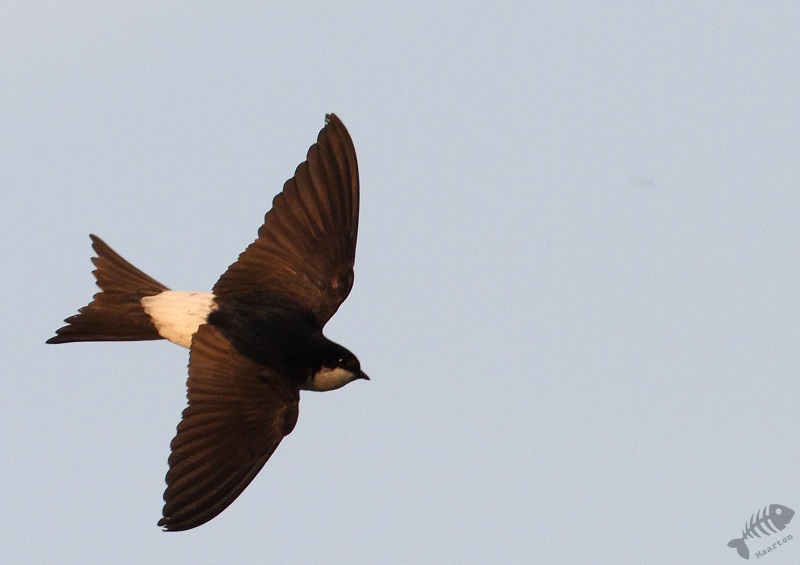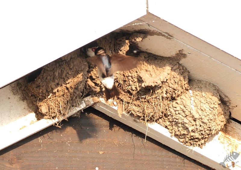 Hierna heb ik deze kant van de polder weer verlaten en ben naar de andere kant gegaan. Ook hier trof ik weer Zwaluwen: Huiszwaluwen. Aan een schuur zaten verschillende nesten geplakt en er was volop vliegverkeer. Ik heb geprobeerd de vliegende exemplaren te pakken te krijgen, maar dit is bijna onmogelijk met mijn spullen (dat is dus weer het nadeel van 500mm…). Nou ben ik fel tegen nestfotografie en zal hier nooit aan doen, maar ik heb die avond een uitzondering gemaakt. De Zwaluwen leken zich niet aan mij te storen (de afstand was dan ook aanzienlijk) en ik weet zeker dat ik niks verstoorde. Ik heb dus enkele opnamen gemaakt van het voeren van de jongen, wat ook mooi was om te zien.