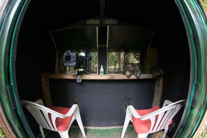 De hut was een stuk kleiner dan de eerste hut. Er stonden 2 stoelen en dan was er nog maar iets ruimte over. Het watertje lag een stukje verderop, wat hoger, zodat je er vanuit de hut overheen keek. Ik vond het een heel leuke setting, echt anders dan bij hut 1.
