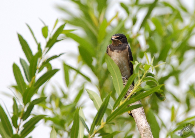 Nou, het bleek een waar Zwaluw paradijs te zijn. In de hut zat nog een nest en erbuiten zaten tientallen Boerenzwaluwen en Oeverzwaluwen. Toen ik een tijdje rustig was blijven staan, gingen ze in een boom naast de hut zitten en kon ik eindelijk de Oeverzwaluw heel aardig vastleggen. Jammer was wel dat ze vrij hoog in de boom bleven zitten, maar toch zaten er aardige plaatjes bij. Zo ook van de Boerenzwaluw. Aan de rand van de plas zat een Oeverloper, maar deze heb ik allen staan observeren.