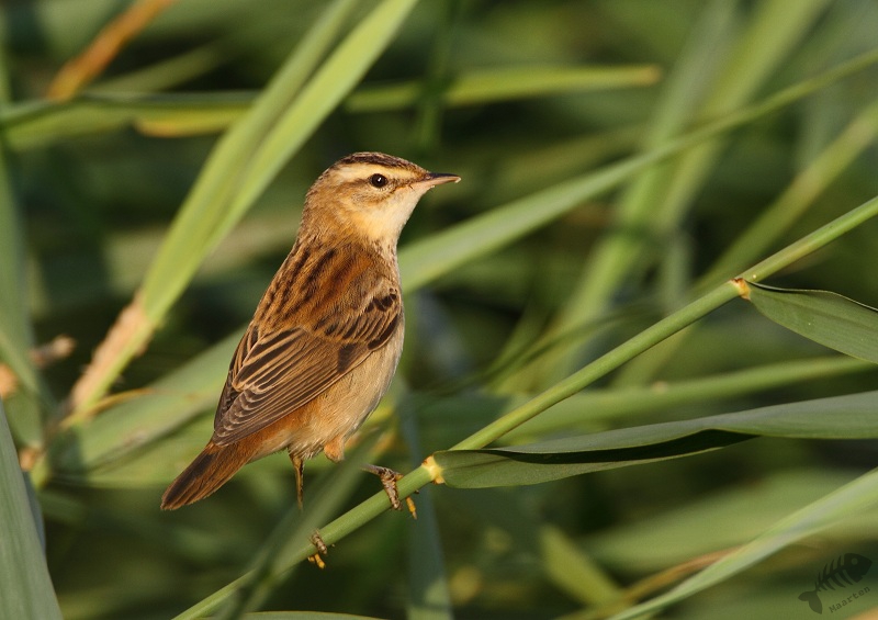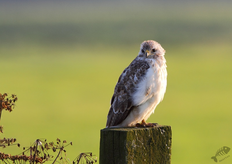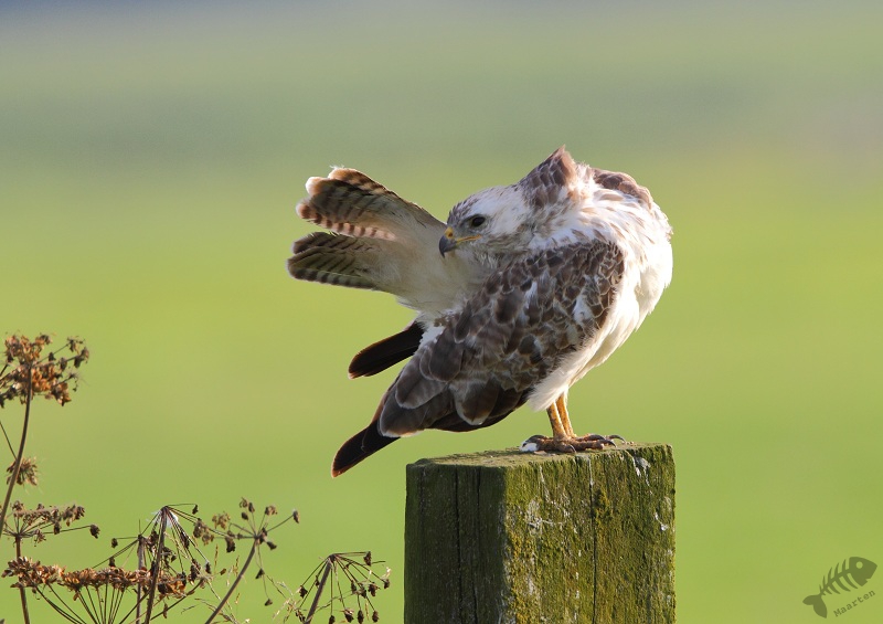 Toen ik een stukje terugreed zag ik ineens de inmiddels bekende Buizerd weer zitten. Ook deze zat een beetje te soezen in de zon, wat het fotograferen wat lastig maakte: de donkere kleur op de rug werd alsmaar donkerder in de schaduw en het licht op de borst lichter in de zon. Dus na zo’n 250 opnamen ben ik gestopt met hem te fotograferen in de hoop dat er 1 belichting tussen zou zitten. Toen ik even de andere kant opkeek in de berm waar wat Riet stond, zag ik, hoe kan het ook anders, ineens een Rietzanger. Ik had hier dit jaar nog geen fatsoenlijke foto’s van kunnen maken, dus ik was blij deze te zien.